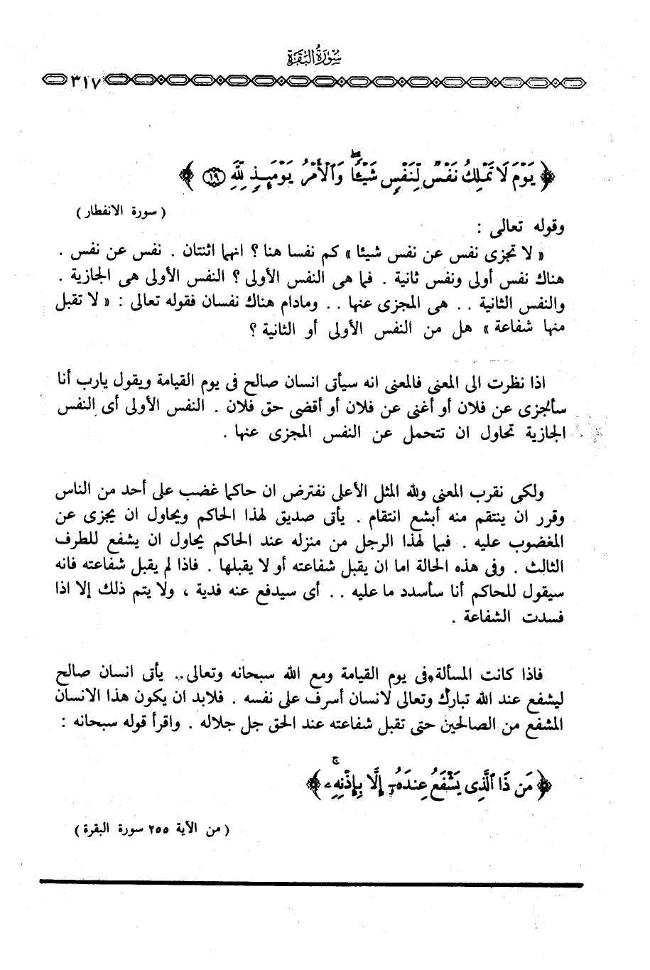 وقوله تعالى: {لاَّ تَجْزِي نَفْسٌ عَن نَّفْسٍ شَيْئاً} كم نفسا هنا؟ إنهما اثنتان. نفس عن نفس. هناك نفس أولى ونفس ثانية. فما هي النفس الأولى؟ النفس الأولى هي الجازية. والنفس الثانية. . هي المجزي عنها. . ومادام هناك نفسان فقوله تعالى: {لاَ يُقْبَلُ مِنْهَا شَفَاعَةٌ} هل من النفس الأولى أو الثانية؟