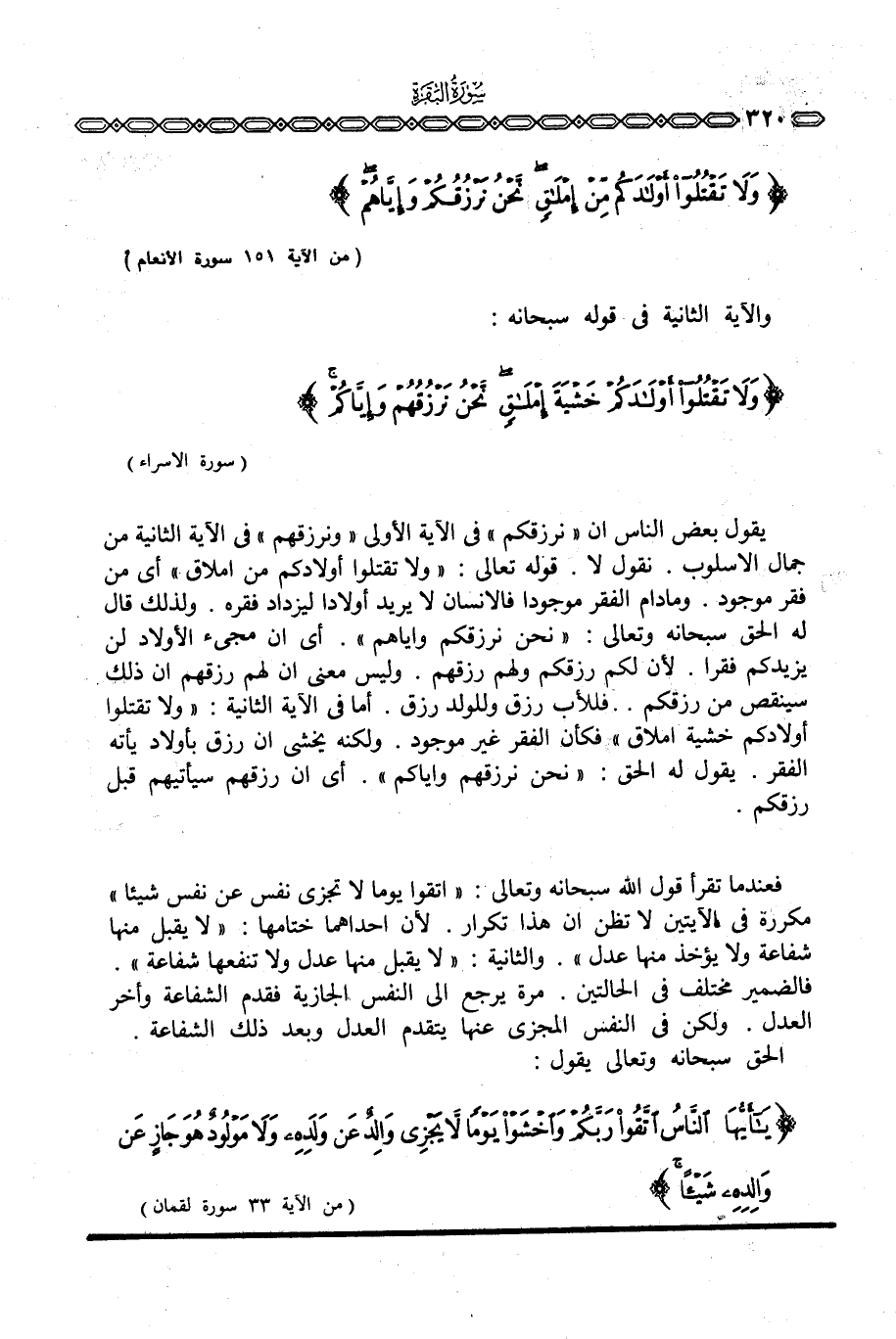 يقول بعض الناس إن «نرزقكم» في الآية الأولى «ونرزقهم» في الآية الثانية من جمال الأسلوب. نقول لا. قوله تعالى: {وَلاَ تقتلوا أَوْلاَدَكُمْ مِّنْ إمْلاَقٍ} أي من فقر موجود. ومادام الفقر موجودا فالإنسان لا يريد أولادا ليزداد فقره. ولذلك قال له الحق سبحانه وتعالى: {نَّحْنُ نَرْزُقُكُمْ وَإِيَّاهُمْ} . أي أن مجيء الأولاد لن يزيدكم فقرا. لأن لكم رزقكم ولهم رزقهم. وليس معنى أن لهم رزقهم أن ذلك سينقص من رزقكم. . فللأب رزق وللولد رزق. أما في الآية الثانية: {وَلاَ تقتلوا أَوْلادَكُمْ خَشْيَةَ إِمْلاقٍ} فكأن الفقر غير موجود. ولكنه يخشى أن رزق بأولاد بأنه الفقر. يقول له الحق: {نَّحْنُ نَرْزُقُهُمْ وَإِيَّاكُم} . أي أن رزقهم سيأتيهم قبل رزقكم.