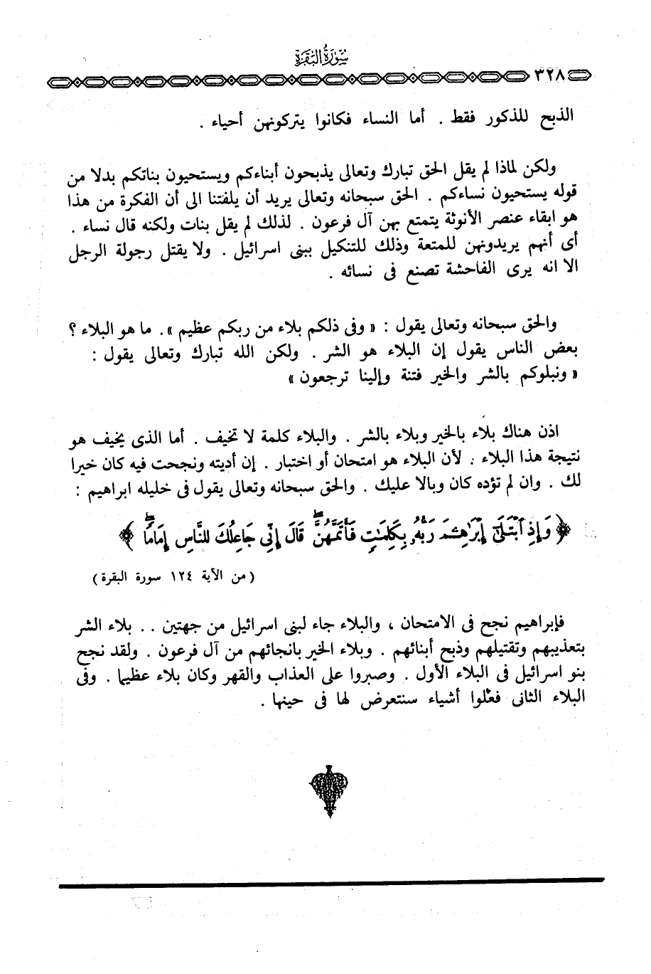 فإبراهيم نجح في الامتحان، والبلاء جاء لبني إسرائيل من جهتين. . بلاء الشر بتعذيبهم وتقتيلهم وذبح أبنائهم. وبلاء الخير بإنجائهم من آل فرعون. ولقد نجح بنو إسرائيل في البلاء الأول. وصبروا على العذاب والقهر وكان بلاء عظيما. وفي البلاء الثاني فعلوا أشياء سنتعرض لها في حينها.