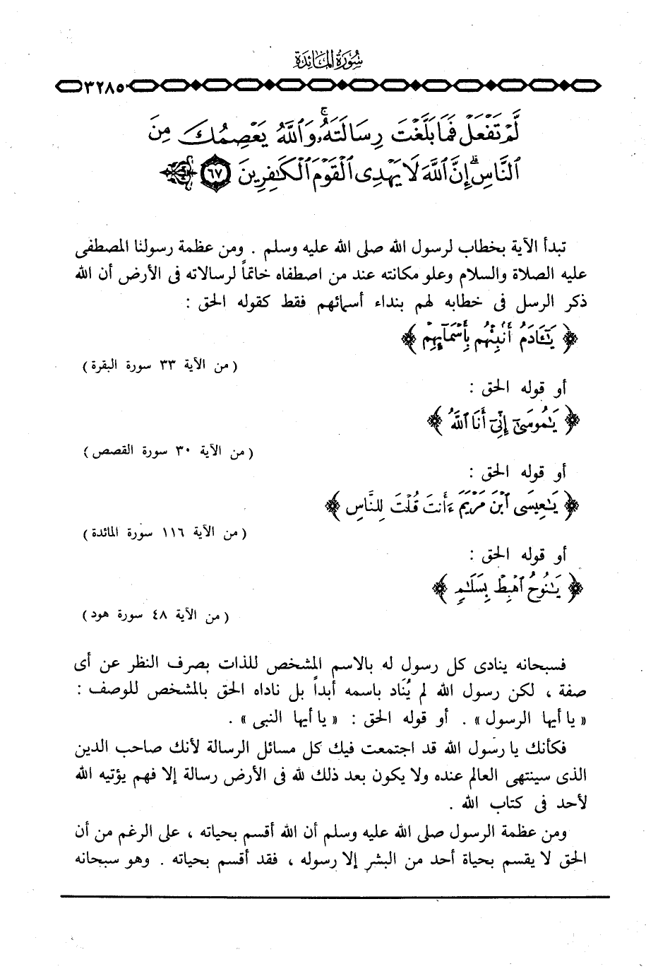 فسبحانه ينادي كل رسول له بالاسم المشخص للذات بصرف النظر عن أي صفة، لكن رسول الله لم يُناد باسمه أبداً بل ناداه الحق بالمشخص للوصف: «يا أيها الرسول» . أو قوله الحق: «يا أيها النبي» .
