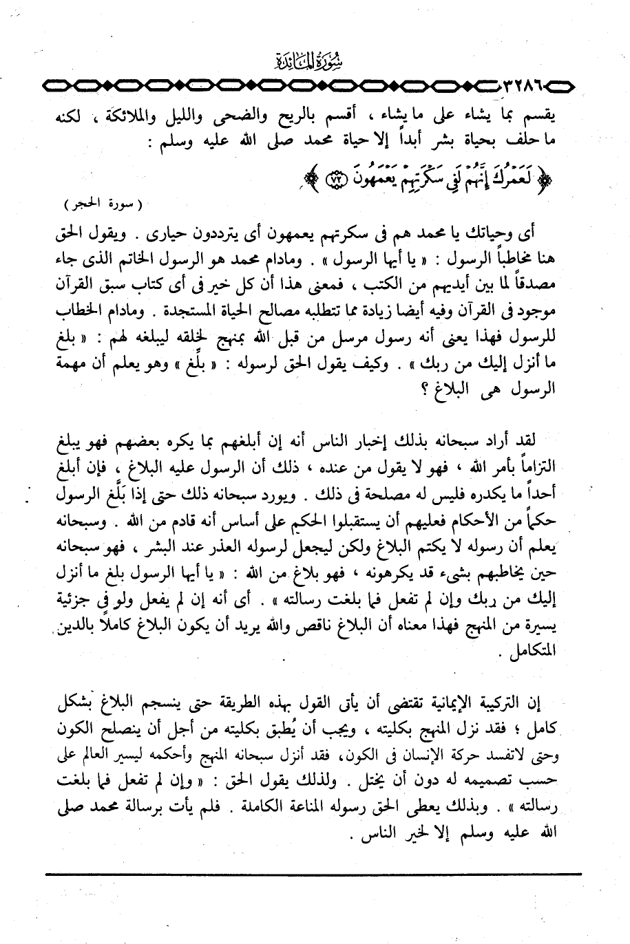 أي وحياتك يا محمد هم في سكرتهم يعمهون أي يترددون حيارى. ويقول الحق هنا مخاطباً الرسول: «يا أيها الرسول» . وما دام محمد هو الرسول الخاتم الذي جاء مصدقاً لما بين أيديهم من الكتب، فمعنى هذا أن كل خير في أي كتاب سبق القرآن موجود في القرآن وفيه أيضاً زيادة مما تتطلبه مصالح الحياة المستجدة. وما دام الخطاب للرسول فهذا يعني أنه رسول مرسل من قبل الله بمنهج لخلقه ليبلغه لهم: {بَلِّغْ مَآ أُنزِلَ إِلَيْكَ مِن رَّبِّكَ} . وكيف يقول الحق لرسوله: «بلِّغ» وهو أن يعلم أن مهمة الرسول هي البلاغ؟
