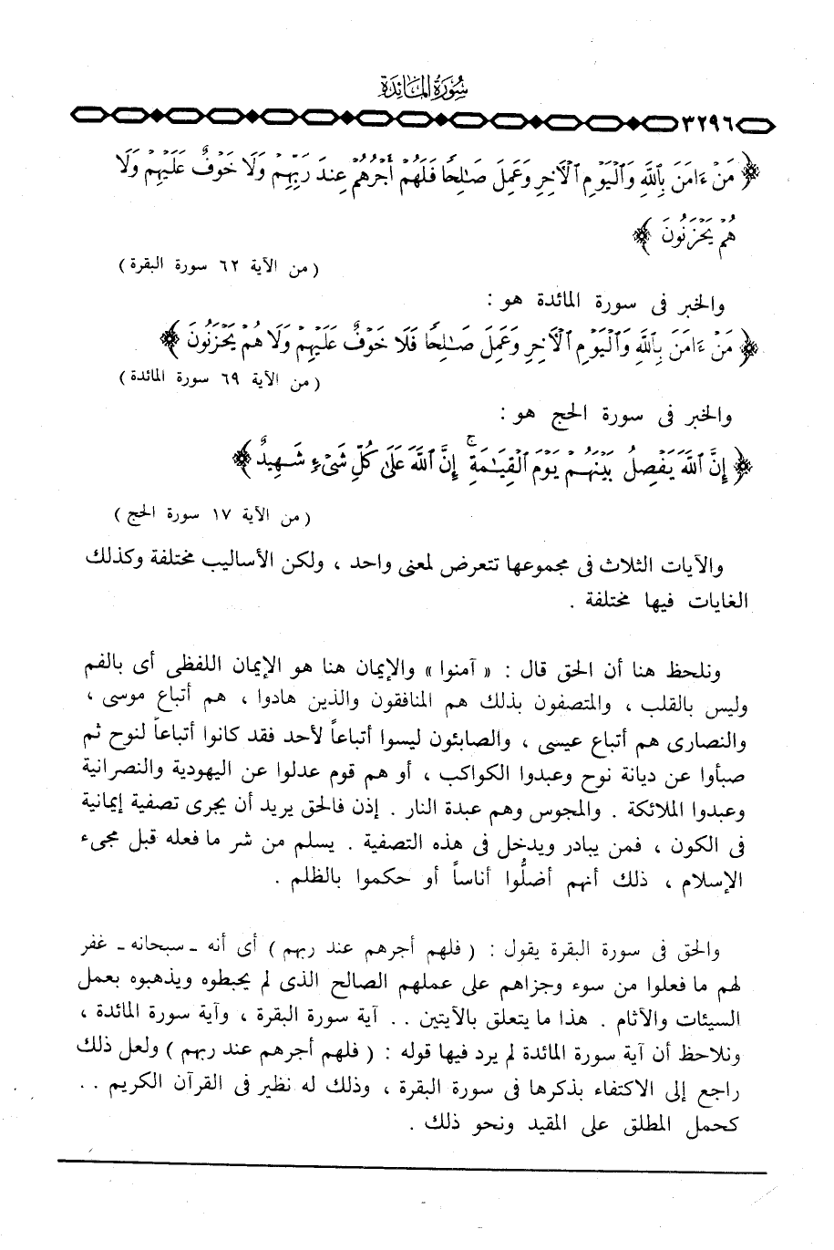 والحق في سورة البقرة يقول: {فَلَهُمْ أَجْرُهُمْ عِندَ رَبِّهِمْ} أي أنه - سبحانه - غفر لهم ما فعلوا من سوء وجزاهم على عملهم الصالح الذي لم يحبطوه ويذهبوه بعمل السيئات والآثام. هذا ما يتعلق بالآيتين ... آية سورة البقرة، وآية سورة المائدة، ونلاحظ أن آية سورة المائدة لم يرد فيها قوله: {فَلَهُمْ أَجْرُهُمْ عِندَ رَبِّهِمْ} ولعل ذلك راجع إلى الاكتفاء بذكرها في سورة البقرة، وذلك له نظير في القرآن الكريم.