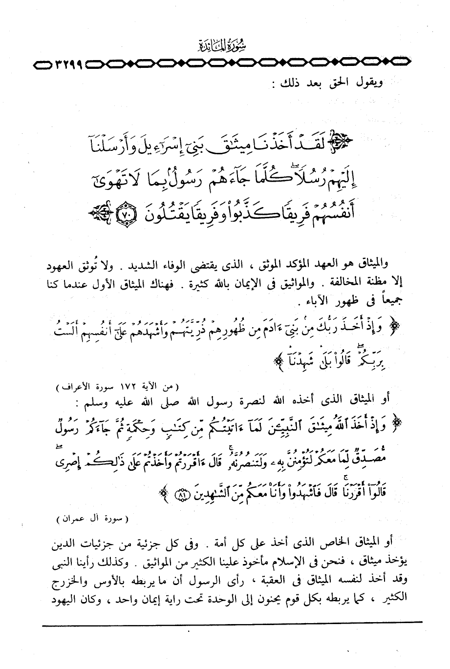 أو الميثاق الخاص الذي أخذ على كل أمة. وفي كل جزئية من جزئيات الدين يؤخذ ميثاق، فنحن في الإسلام مأخوذ علينا الكثير من المواثيق. وكذلك رأينا النبي وقد أخذ لنفسه الميثاق في العقبة، رأى الرسول أن ما يربطه بالأوس والخزرج الكثير، كما يربطه بكل قوم يحنون إلى الوحدة تحت راية إيمان واحد، وكان اليهود
