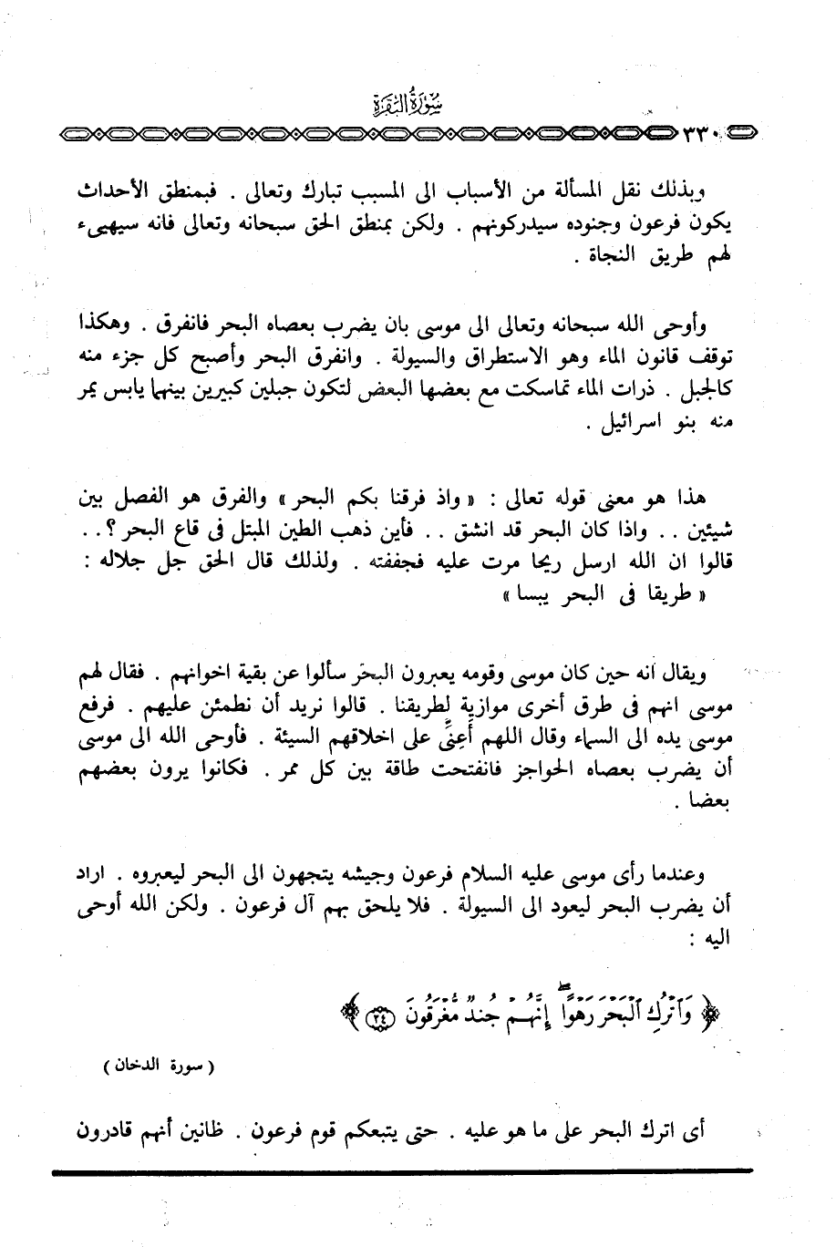 وأوحى الله سبحانه وتعالى إلى موسى بأن يضرب بعصاه البحر فانفرق. وهكذا توقف قانون الماء وهو الاستطراق والسيولة. وانفرق البحر وأصبح كل جزء منه كالجبل. ذرات الماء تماسكت مع بعضها البعض لتكون جبلين كبيرين بينهما يابس يمر منه بنو إسرائيل.