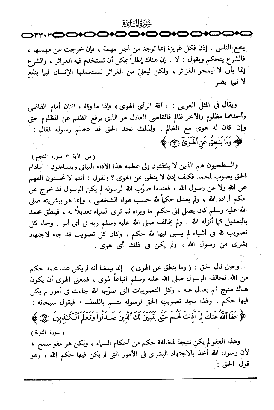 وحين قال الحق: {وَمَا يَنطِقُ عَنِ الهوى} . إنما يبلغنا أنه لم يكن عند محمد حكم من الله فخالفه الرسول صَلَّى اللَّهُ عَلَيْهِ وَسَلَّم َ اتباعاً لهوى، فمعنى الهوى أن يكون هناك منهج ثم يعدل عنه، وكل التصويبات التي صوّبها الله جاءت في أمور لم يكن فيها حكم. ولهذا نجد تصويب الحق لرسوله يتسم باللطف، فيقول سبحانه: {عَفَا الله عَنكَ لِمَ أَذِنتَ لَهُمْ حتى يَتَبَيَّنَ لَكَ الذين صَدَقُواْ وَتَعْلَمَ الكاذبين} [التوبة: 43] .