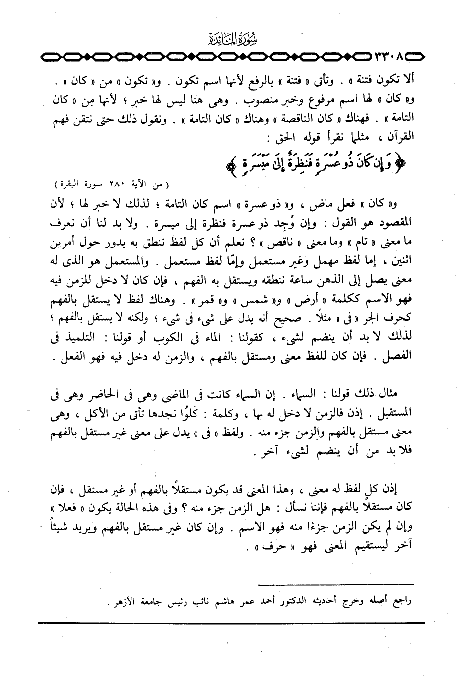 و» كان «فعل ماضي، و» ذو عسرة «اسم كان التامة؛ لذلك لا خبر لها؛ لأن المقصود هو القول: وإن وُجِد ذو عسرة فنظرة إلى ميسرة. ولا بد لنا أن نعرف ما معنى» تام «وما معنى» ناقص «؟ نعلم أن كل لفظ ننطق به ويدور حول أمرين اثنين، إما لفظ مهمل وغير مستعمل وإمّا لفظ مستعمل. والمستعمل هو الذي له معنى يصل إلى الذهن ساعة نطقه ويستقل به الفهم، فإن كان لا دخل للزمن فيه فهو الاسم ككلمة» أرض «و» شمس «و» قمر «. وهناك لفظ لا يستقل بالفهم كحرف الجر» في «مثلاً. صحيح أنه يدل على شيء في شيء؛ ولكنه لا يستقل بالفهم؛ لذلك لا بد أن ينضم لشيء، كقولنا: الماء في الكوب أو قولنا: التلميذ في الفصل. فإذا كان للفظ معنى ومستقل بالفهم، والزمن له دخل فيه فهو الفعل.