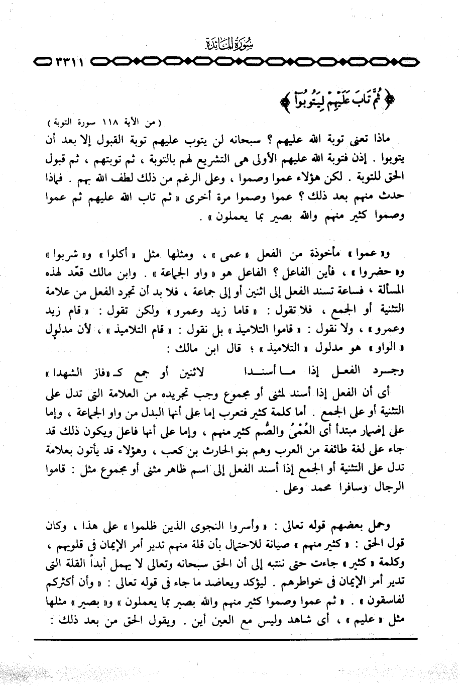 ماذا تعني توبة الله عليهم؟ سبحانه لن يتوب عليهم توبة القبول إلا بعد أن يتوبوا. إذن فتوبة الله عليهم الأولى هي التشريع لهم بالتوبة، ثم توبتهم، ثم قبول الحق للتوبة. لكن هؤلاء عموا وصموا، وعلى الرغم من ذلك لطف الله بهم. فماذا حدث منهم بعد ذلك؟ عموا وصموا مرة أخرى {ثُمَّ تَابَ الله عَلَيْهِمْ ثُمَّ عَمُواْ وَصَمُّواْ كَثِيرٌ مِّنْهُمْ والله بَصِيرٌ بِمَا يَعْمَلُونَ} .