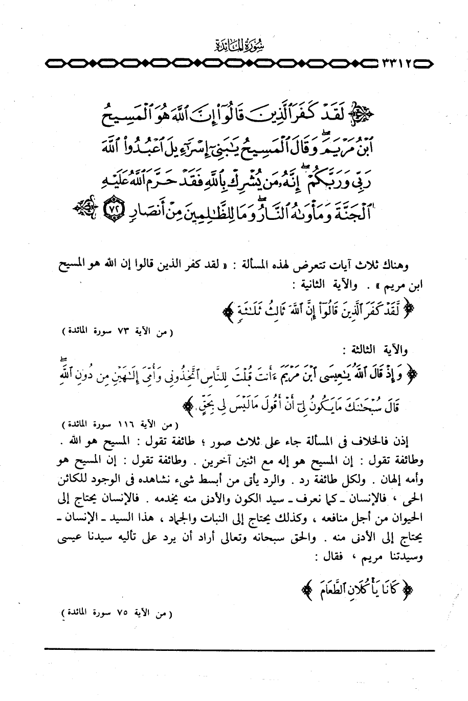 وهناك ثلاث آيات تتعرض لهذه المسألة: {لَقَدْ كَفَرَ الذين قالوا إِنَّ الله هُوَ المسيح ابن مَرْيَمَ} . والآية الثانية: {لَّقَدْ كَفَرَ الذين قالوا إِنَّ الله ثَالِثُ ثَلاَثَةٍ} [المائدة: 73] .