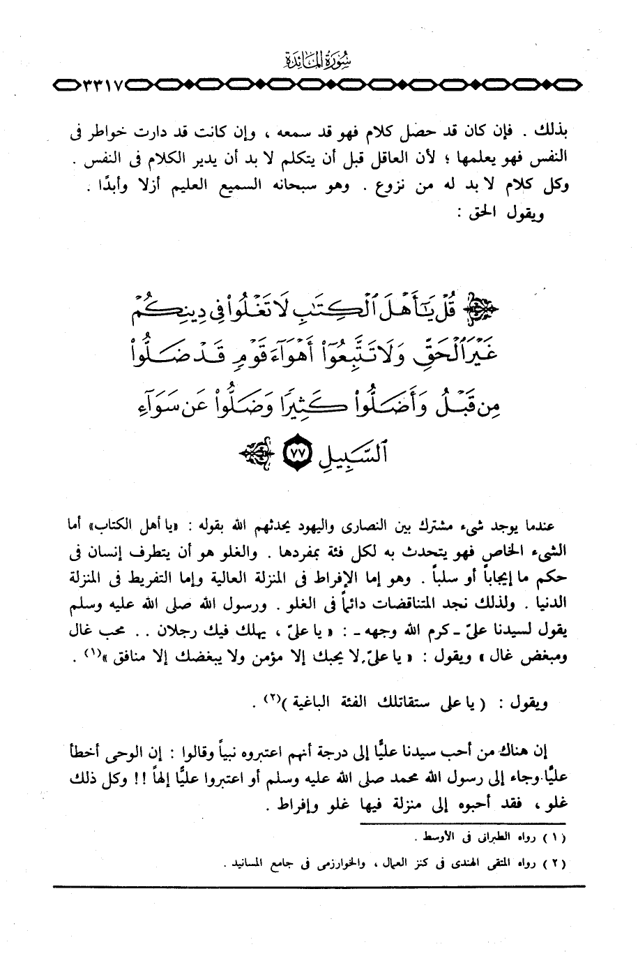عندما يوجد شيء مشترك بين النصارى واليهود يحدثهم الله بقوله: {قُلْ ياأهل الكتاب} أما الشيء الخاص فهو يتحدث به لكل فئة بمفردها. والغلو هو أن يتطرف إنسان في حكم ما إيجاباً أو سلباً. وهو إما الإفراط في المنزلة العالية وإما التفريط في المنزلة الدنيا. ولذلك نجد المتناقضات دائماً في الغلو. «ورسول الله صَلَّى اللَّهُ عَلَيْهِ وَسَلَّم َ يقول لسيدنا علي - كرم الله وجهه -: يا عليّ، يهلك فيك رجلان. . محب غال ومبغض غال» ويقول: «يا عليّ لا يحبك إلا مؤمن ولا يبغضك إلا منافق» .