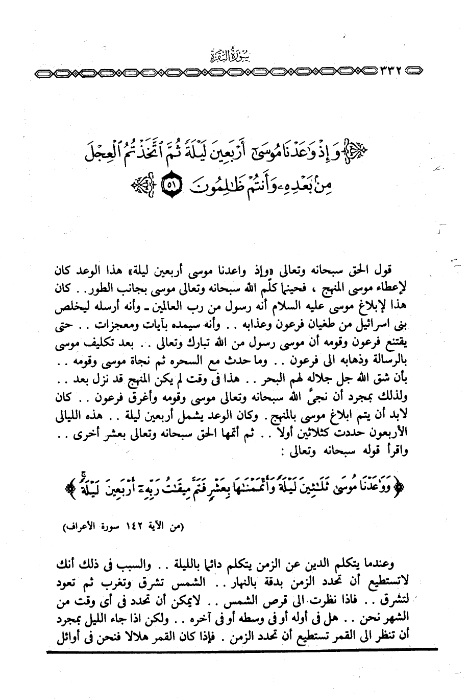 قول الحق سبحانه وتعالى {وَإِذْ وَاعَدْنَا موسى أَرْبَعِينَ لَيْلَةً} هذا الوعد كان لإعطاء موسى المنهج، فحينما كلّم الله سبحانه وتعالى موسى بجانب الطور. . كان هذا لإبلاغ موسى عليه السلام أنه رسول من رب العالمين وأنه أرسله ليخلص بني إسرائيل من طغيان فرعون وعذابه. . وأنه سيمده بآيات ومعجزات. . حتى يقتنع فرعون وقومه أن موسى رسول من الله تبارك وتعالى. . بعد تكليف موسى بالرسالة وذهابه إلى فرعون. . وما حدث مع السحره ثم نجاة موسى وقومه. . بأن شق الله جل جلاله لهم البحر. . هذا في وقت لم يكن المنهج قد نزل بعد. . ولذلك بمجرد أن نجَّى الله سبحانه وتعالى موسى وقومه وأغرق فرعون. . كان لابد أن يتم إبلاغ موسى بالمنهج. وكان الوعد يشمل أربعين ليلة. . هذه الليالي الأربعون حددت كثلاثين أولا. . تم أتمها الحق سبحانه وتعالى بعشر أخرى. . واقرأ قوله سبحانه وتعالى: {وَوَاعَدْنَا موسى ثَلاَثِينَ لَيْلَةً وَأَتْمَمْنَاهَا بِعَشْرٍ فَتَمَّ مِيقَاتُ رَبِّهِ أَرْبَعِينَ لَيْلَةً} [الأعراف: 142]