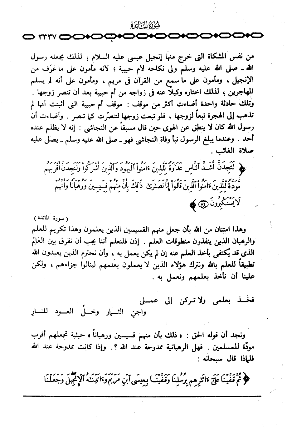 وهذا امتنان من الله بأن جعل منهم القسيسين الذي يعلمون وهذا تكريم للعلم والرهبان الذين ينفذون منطوقات العلم. إذن فلنعلم أننا يجب أن نفرق بين العَالِم الذي قد يُكتفى بأخذ العلم عنه إن لم يكن يعمل به، وأن نحترم الذين يعبدون الله تطبيقاً للعلم بالله ونترك هؤلاء الذين لا يعملون بعلمهم لينالوا جزاءهم، ولكن علينا أن نأخذ بعلمهم ونعمل به.