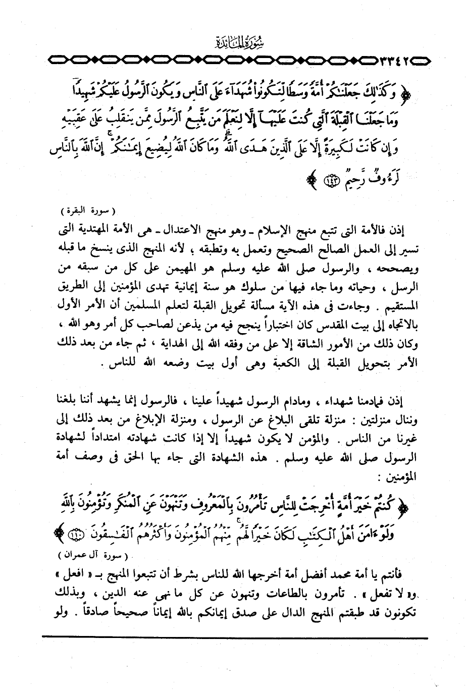 إذن فالأمة التي تتبع منهج الإسلام - وهو منهج الاعتدال - هي الأمة المهتدية التي تسير إلى العمل الصالح الصحيح وتعمل به وتطبقه؛ لأنه المنهج الذي ينسخ ما قبله ويصححه، والرسول صَلَّى اللَّهُ عَلَيْهِ وَسَلَّم َ هو المهيمن على كل من سبقه من الرسل، وحياته وما جاء فيها من سلوك هو سنة إيمانية تهدي المؤمنين إلى الطريق المستقيم. وجاءت في هذه الآية مسألة تحويل القبلة لتعلم المسلمين أن الأمر الأول بالاتجاه إلى بيت المقدس كان اختباراً ينجح فيه من يذعن لصاحب كل أمر وهو الله، وكان ذلك من الأمور الشاقة إلا على من وفقه الله إلى الهداية، ثم جاء من بعد ذلك الأمر بتحويل القبلة إلى الكعبة وهي أول بيت وضعه الله للناس.