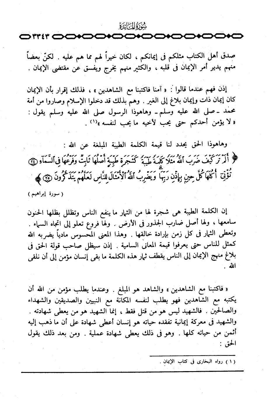 إن الكلمة الطيبة هي شجرة لها من الثمار ما ينفع الناس وتظل بظلها الحنون سامعها، ولها أصل ضارب الجذور في الأرض. ولها فروع تعلو إلى اتجاه السماء. وتعطي الثمار في كل زمن بإرادة خالقها. وهذا المعنى المحسوس مادياً يضربه الله كمثل للناس حتى يعرفوا قيمة المعاني السامية. إذن سيظل صاحب قوله الحق في بلاغ منهج الإيمان إلى الناس يقطف ثمار هذه الكلمة ما بقي إنسان مؤمن إلى أن نلقى الله.