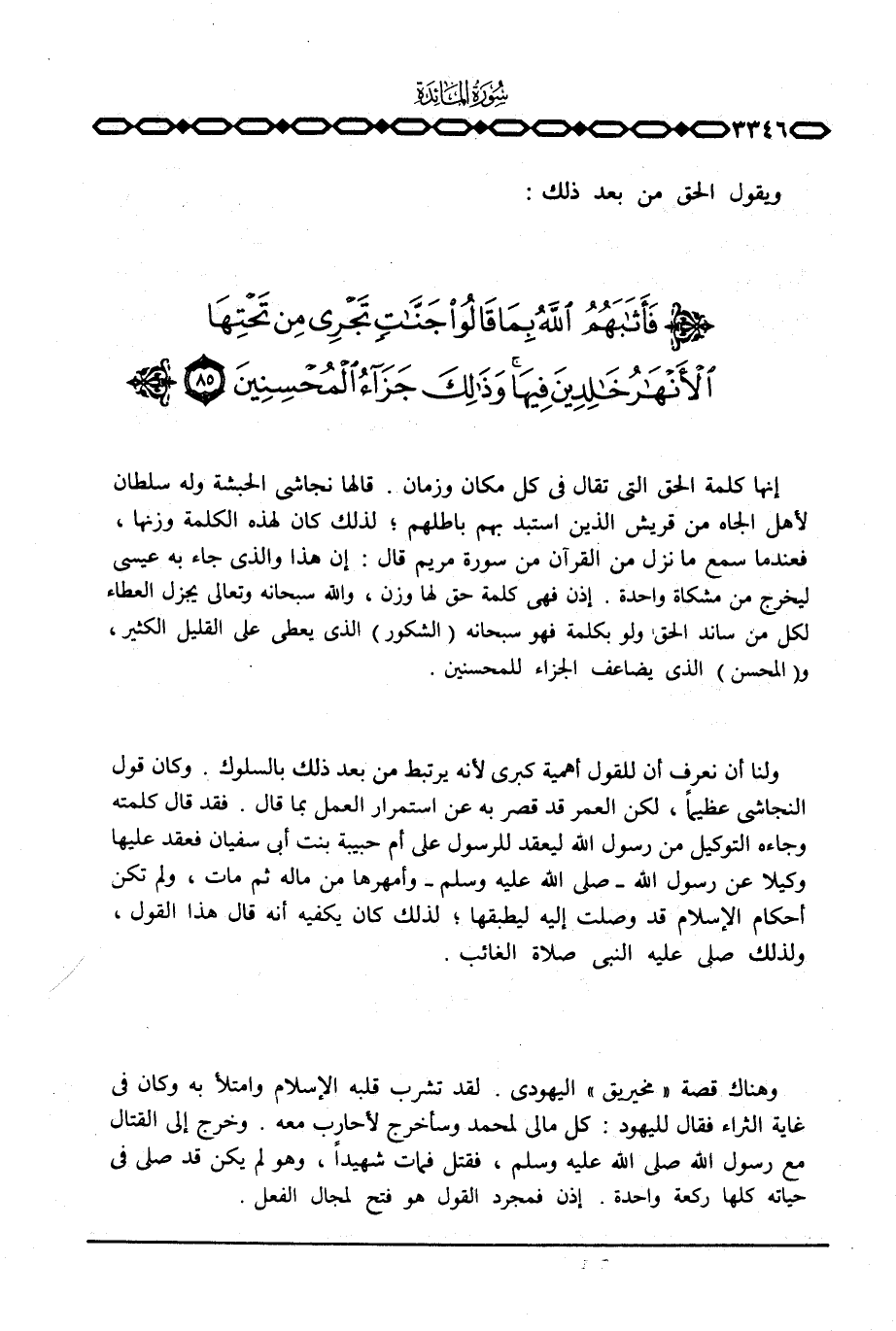إنها كلمة الحق التي تقال في كل مكان وزمان. قالها نجاشي الحبشة وله سلطان لأهل الجاه من قريش الذين استبد بهم باطلهم؛ لذلك كان لهذه الكلمة وزنها، فعندما سمع ما نزل من القرآن من سورة مريم قال: إن هذا والذي جاء به عيسى ليخرج من مشكاة واحدة. إذن فهي كلمة حق لها وزن، والله سبحانه وتعالى يجزل العطاء لكل من ساند الحق ولو بكلمة فهو سبحانه (الشكور) الذي يعطي على القليل الكثير، و (المحسن) الذي يضاعف الجزاء للمحسنين.
