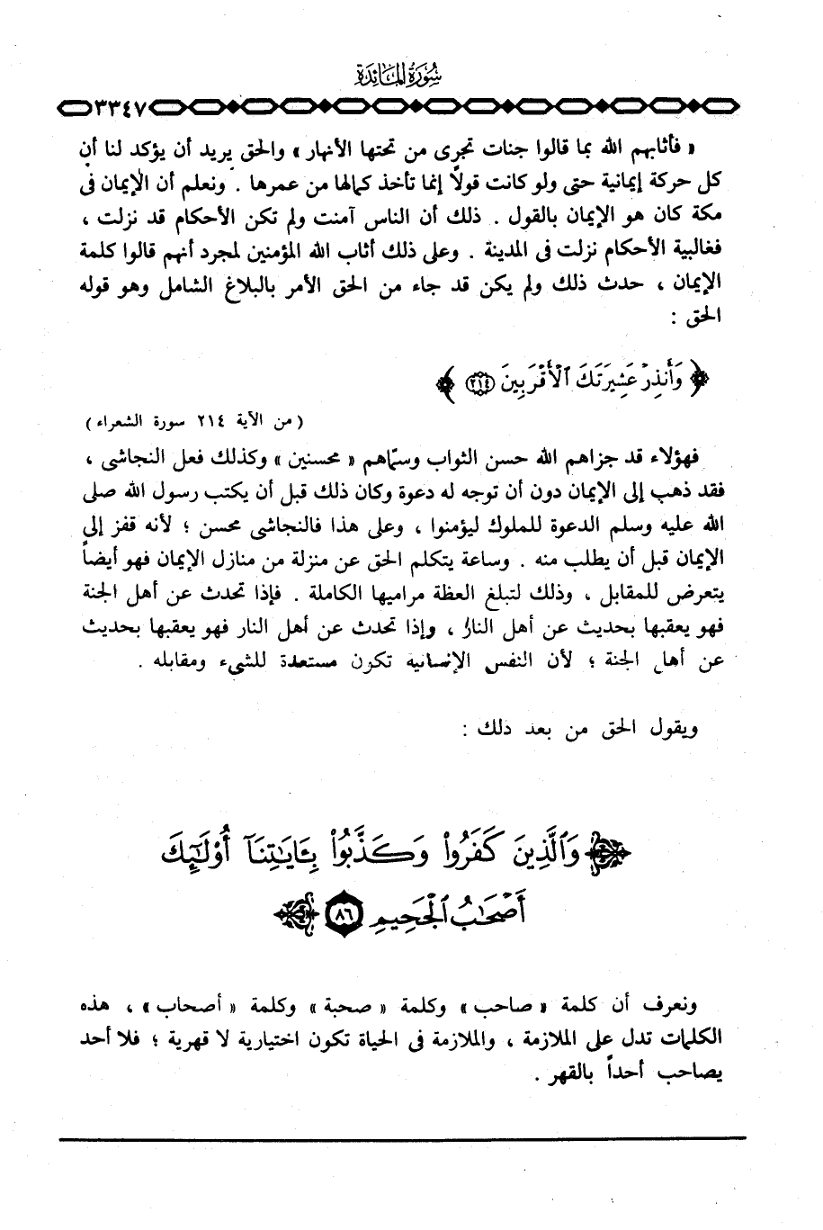 فهؤلاء قد جزاهم الله حسن الثواب وسمّاهم «محسنين» وكذلك فعل النجاشي، فقد ذهب إلى الإيمان دون أن توجه له دعوة وكان ذلك قبل أن يكتب رسول الله صَلَّى اللَّهُ عَلَيْهِ وَسَلَّم َ الدعوة للملوك ليؤمنوا، وعلى هذا فالنجاشي محسن؛ لأنه قفز إلى الإيمان قبل أن يطلب منه. وساعة يتكلم الحق عن منزلة من منازل الإيمان فهو أيضاً يتعرض للمقابل، وذلك لتبلغ العظة مراميها الكاملة. فإذا تحدث عن أهل الجنة فهو يعقبها بحديث عن أهل النار، وإذا تحدث عن أهل النار فهو يعقبها بحديث عن أهل الجنة؛ لأن النفس الإنسانية تكون مستعدة للشيء ومقابله.