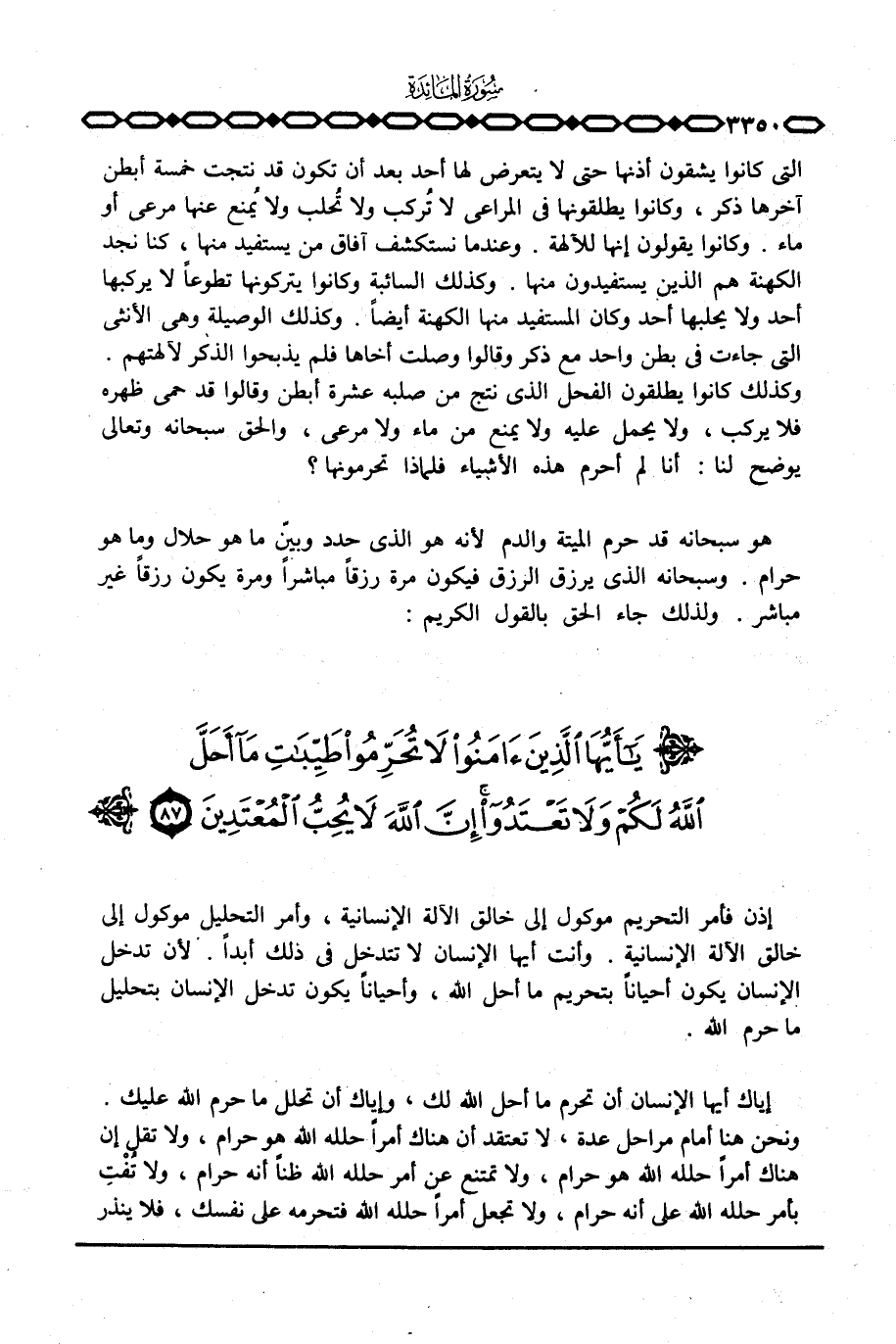 التي كانوا يشقون أذنها حتى لا يتعرض لها أحد بعد أن تكون قد نتجت خمسة أبطن آخرها ذكر، وكانوا يطلقونها في المراعي لا تُركب ولا تُحلب ولا يُمنع عنها مرعى أو ماء. وكانوا يقولون إنها للآلهة. وعندما نستكشف آفاق من يستفيد منها، كنا نجد الكهنة هم الذين يستفيدون منها. وكذلك السائبة وكانوا يتركونها تطوعاً لا يركبها أحد ولا يحلبها أحد وكان المستفيد منها الكهنة أيضاً. وكذلك الوصيلة وهي الأنثى التي جاءت في بطن واحد مع ذكر وقالوا وصلت أخاها فلم يذبحوا الذكر لآلهتهم. وكذلك كانوا يطلقون الفحل الذي نتج من صلبه عشرة أبطن وقالوا قد حمى ظهره فلا يركب، ولا يحمل عليه ولا يمنع من ماء ولا مرعى، والحق سبحانه وتعالى يوضح لنا: أنا لم أحرم هذه الأشياء فلماذا تحرمونها؟