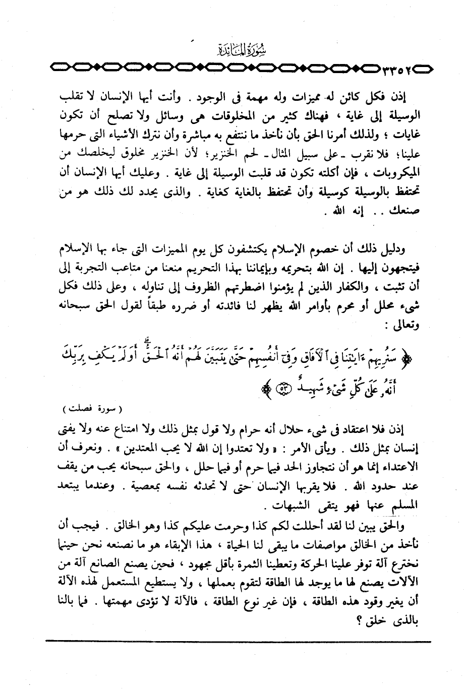 والحق يبين لنا قد أحللت لكم كذا وحرمت عليكم كذا وهو الخالق. فيجب أن نأخذ من الخالق مواصفات ما يبقي لنا الحياة؛ هذا الإبقاء هو ما نصنعه نحن حينما نخترع آلة توفر علينا الحركة وتعطينا الثمرة بأقل مجهود، فحين يصنع الصانع آلة من الآلات يصنع لها ما يوجد لها الطاقة لتقوم بعملها، ولا يستطيع المستعمل لهذه الآلة أن يغير وقود هذه الطاقة، فإن غير نوع الطاقة، فالآلة لا تؤدي مهمتها. فما بالنا بالذي خلق؟