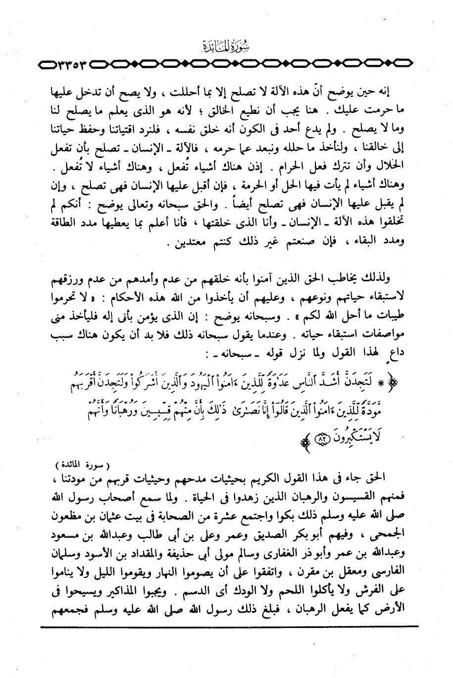 الحق جاء في هذا القول الكريم بحيثيات مدحهم وحيثيات قربهم من مودتنا، فمنهم القسيسون والرهبان الذين زهدوا في الحياة. ولما سمع أصحاب رسول الله صَلَّى اللَّهُ عَلَيْهِ وَسَلَّم َ ذلك بكوا واجتمع عشرة من الصحابة في بيت عثمان بن مظعون الجمحي، وفيهم أبو بكر الصديق وعمر وعلي بن أبي طالب وعبد الله بن مسعود وعبد الله بن عمر وأبو ذر الغفاري وسالم مولى أبي حذيفة والمقداد بن الأسود وسلمان الفارسي ومعقل بن مقرن، واتفقوا على أن يصوموا النهار ويقوموا الليل ولا يناموا على الفرش ولا يأكلوا اللحم ولا الودك أي الدسم. ويجبوا المذاكير ويسيحوا في الأرض كما يفعل الرهبان، فبلغ ذلك رسول الله صَلَّى اللَّهُ عَلَيْهِ وَسَلَّم َ فجمعهم