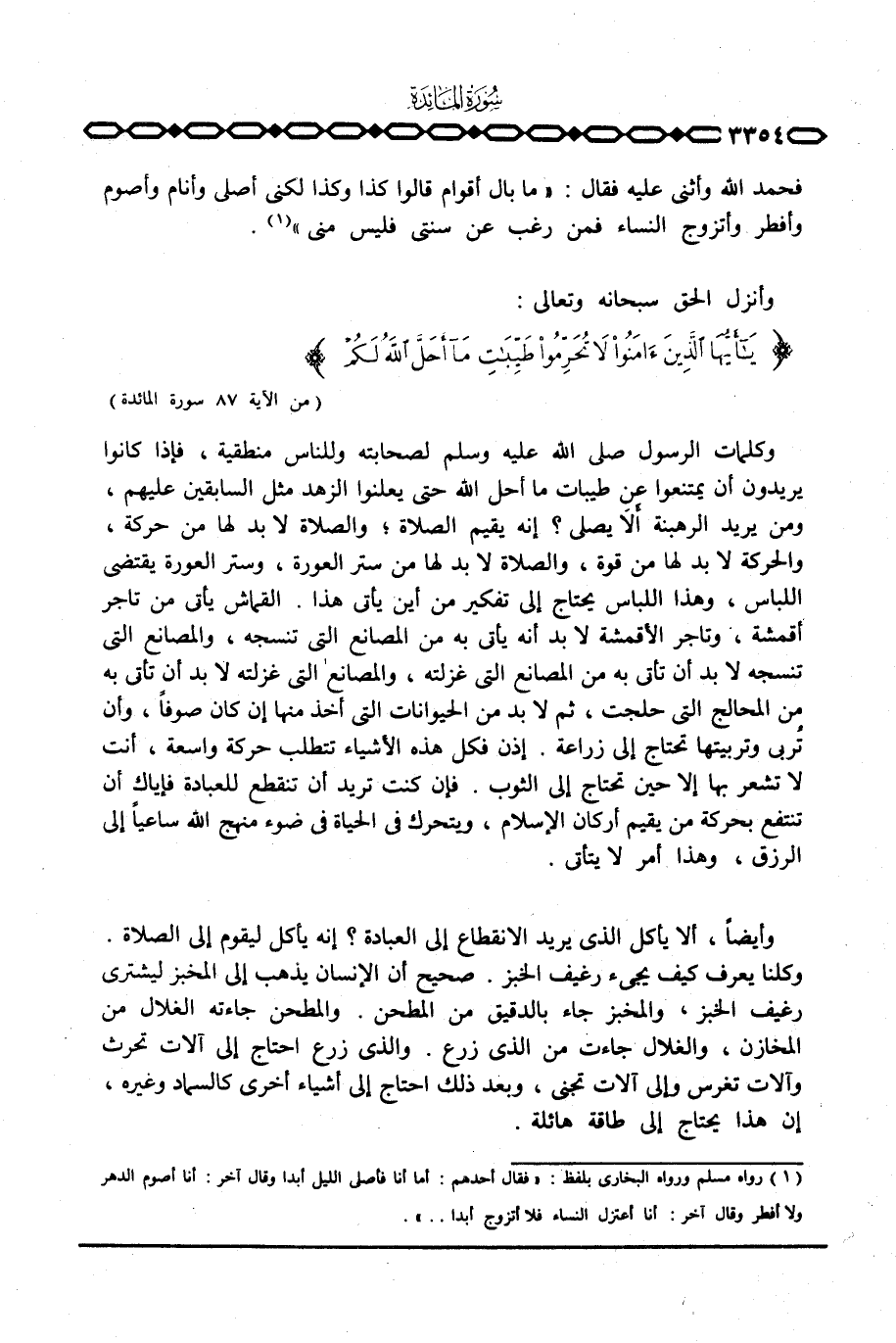 وكلمات الرسول صَلَّى اللَّهُ عَلَيْهِ وَسَلَّم َ لصحابته وللناس منطقية، فإذا كانوا يريدون أن يمتنعوا عن طبيات ما أحل الله حتى يعلنوا الزهد مثل السابقين عليهم، ومن يريد الرهبنة أَلا يصلي؟ أنه يقيم الصلاة؛ والصلاة لا بد لها من حركة، والحركة لا بد لها من قوة، والصلاة لا بد لها من ستر العورة، وستر العورة يقتضي اللباس، وهذا اللباس يحتاج إلى تفكير من أين يأتي هذا. القماش يأتي من تاجر أقمشة، وتاجر الأقمشة لا بد أنه يأتي به من المصانع التي تنسجه، والمصانع التي تنسجه لا بد أن تأتي من المصانع التي غزلته، والمصانع التي غزلته لا بد أن تأتي به من المحالج التي حلجت، ثم لا بد من الحيوانات التي أخذ منها إن كان صوفاً، وأن تُربى وتربيتها تحتاج إلى زراعة. إذن فكل هذه الأشياء تتطلب حركة واسعة، أنت لا تشعر بها إلا حين تحتاج إلى الثوب. فإن كنت تريد أن تنقطع للعبادة فإياك أن تنتفع بحركة من يقيم أركان الإسلام، ويتحرك في الحياة في ضوء منهج الله ساعياً إلى الرزق، وهذا أمر لا يتأتى.