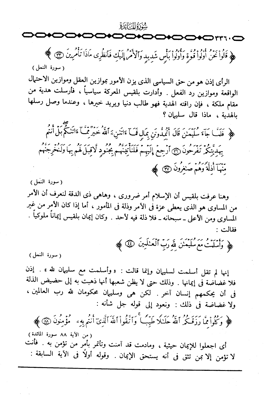 وهنا عرفت بلقيس أن الإسلام أمر ضروري، وها هي ذي الدقة لنعرف أن الأمر من المساوى هو الذي يعطي عزة في الآمر وذلة في المأمور، أما إذا كان الأمر من غير المساوى ومن الأعلى - سبحانه - فلا ذلة فيه لأحد. وكان إيمان بلقيس إيماناً ملوكياً.