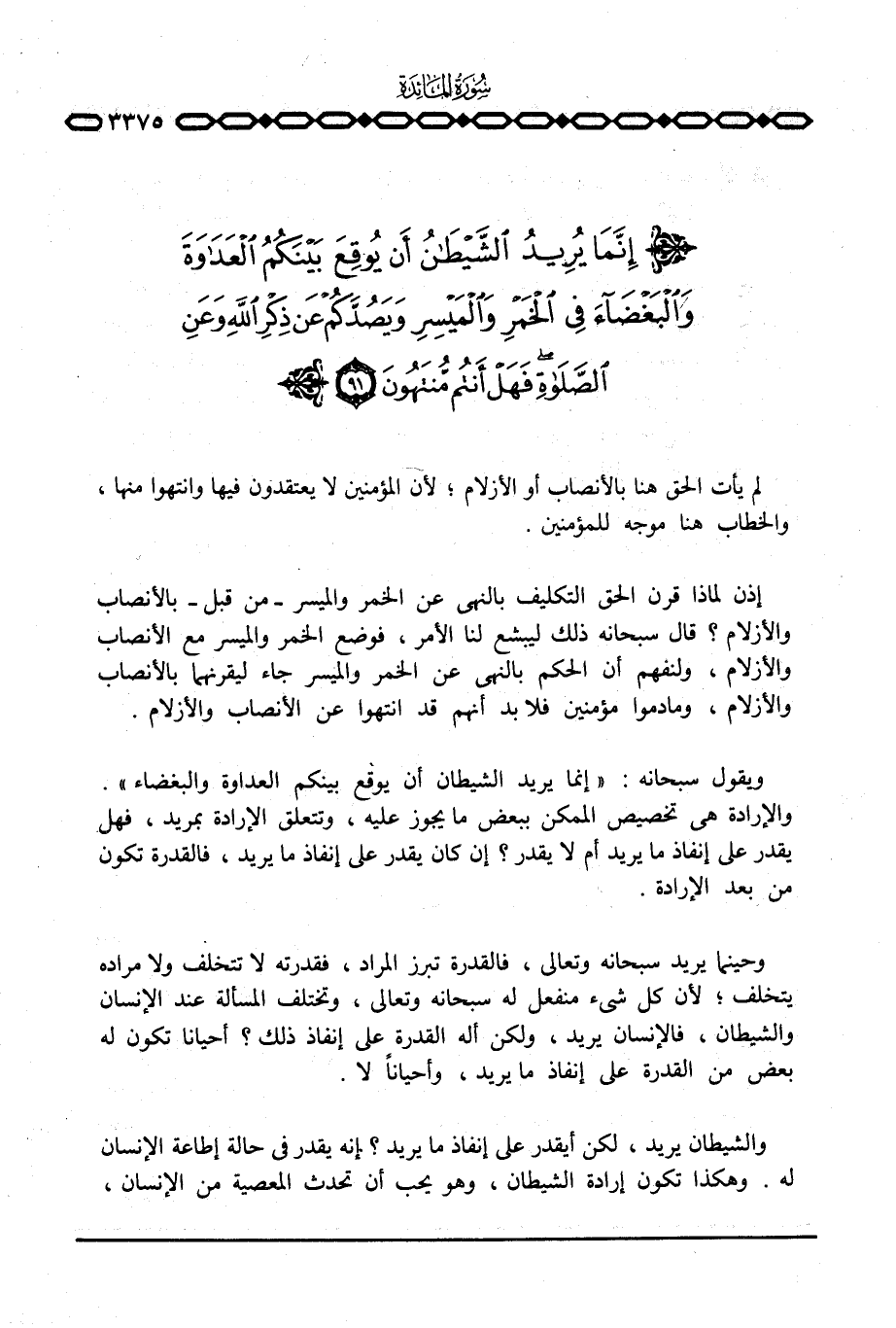 ويقول سبحانه: {إِنَّمَا يُرِيدُ الشيطان أَن يُوقِعَ بَيْنَكُمُ العداوة والبغضآء} . والإرادة هي تخصيص الممكن ببعض ما يجوز عليه، وتتعلق الإرادة بمريد، فهل يقدر على إنقاذ ما يريد أم لا يقدر؟ إن كان يقدر على إنقاذ ما يريد، فالقدرة تكون من بعد الإرادة.