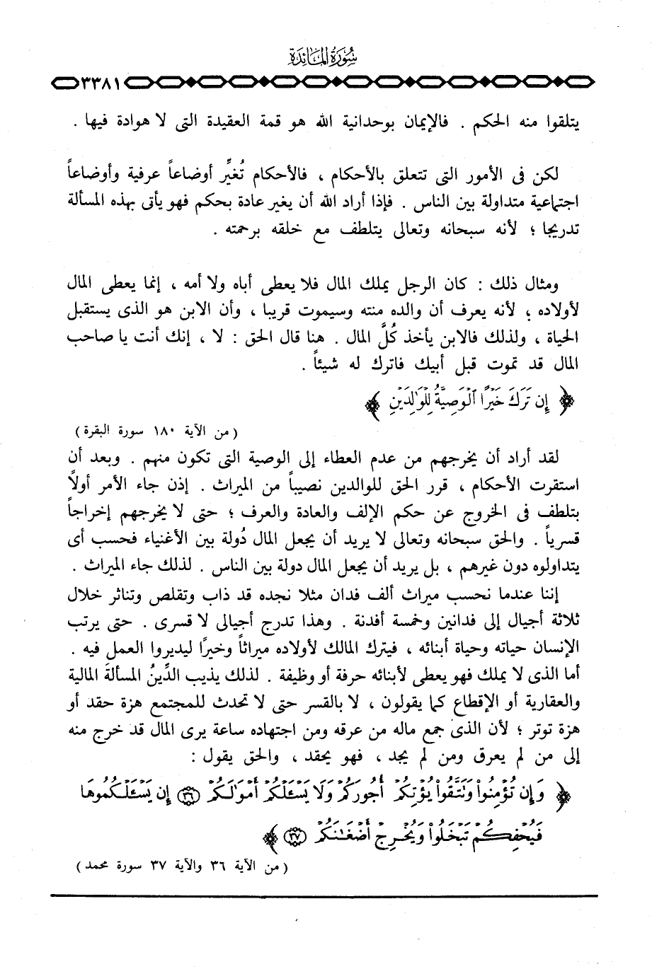 إننا عندما نحسب ميراث ألف فدان مثلا نجده قد ذاب وتقلص وتناثر خلال ثلاثة أجيال إلى فدانين وخمسة أفدنة. وهذا تدرج أجيالي لا قسري. حتى يرتب الإنسان حياته وحياة أبنائه، فيترك المالك لأولاده ميراثاً وخيراً ليديروا العمل فيه. أما الذي لا يملك فهو يعطي لأبنائه حرفة أو وظيفة. لذلك يذيب الدِّيُن المسألةَ المالية والعقارية أو الإقطاع كما يقولون، لا بالقسر حتى لا تحدث للمجتمع هزة حقد أو هزة توتر؛ لأن الذي جمع ماله من عرقه ومن اجتهاده ساعة يرى المال قد خرج منه إلى من لم يعرق ومن لم يجد، فهو يحقد، والحق يقول: {وَإِن تُؤْمِنُواْ وَتَتَّقُواْ يُؤْتِكُمْ أُجُورَكُمْ وَلاَ يَسْأَلْكُمْ أَمْوَالَكُمْ إِن يَسْأَلْكُمُوهَا فَيُحْفِكُمْ تَبْخَلُواْ وَيُخْرِجْ أَضْغَانَكُمْ} [محمد: 36 - 37] .