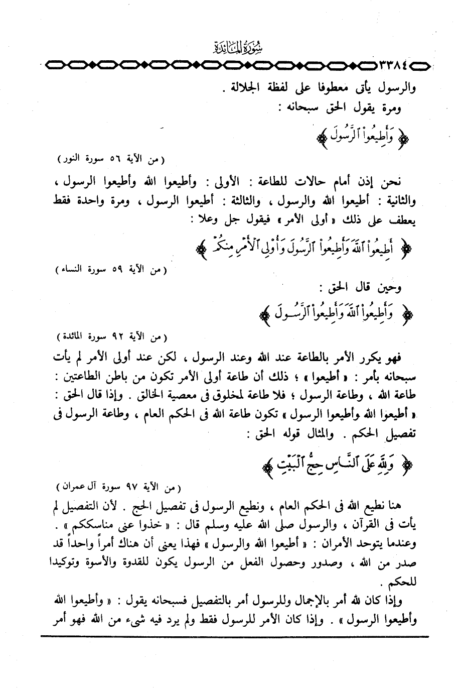 نحن إذن أمام حالات للطاعة: الأولى: وأطيعوا الله وأطيعوا الرسول، والثانية: أطيعوا الله والرسول، والثالثة: أطيعوا الرسول، ومرة واحدة فقط يعطف على ذلك «أولي الأمر» فيقول جل وعلا: {أَطِيعُواْ الله وَأَطِيعُواْ الرسول وَأُوْلِي الأمر مِنْكُمْ} [النساء: 59] .