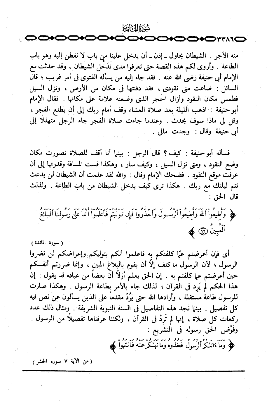 فسأله أبو حنيفة «كيف؟ قال الرجل: بينما أنا أقف للصلاة تصورت مكان وضع النقود، ومتى نزل السيل، وكيف سار، وهكذا قست المسافة وقدرتها إلى أن عرفت موقع النقود. فضحك الإمام وقال: والله لقد علمت أن الشيطان لن يدعك تتم ليلتك مع ربك. هكذا ترى كيف يدخل الشيطان من باب الطاعة. ولذلك قال الحق: {وَأَطِيعُواْ الله وَأَطِيعُواْ الرسول واحذروا فَإِن تَوَلَّيْتُمْ فاعلموا أَنَّمَا على رَسُولِنَا البلاغ المبين} [المائدة: 92] .