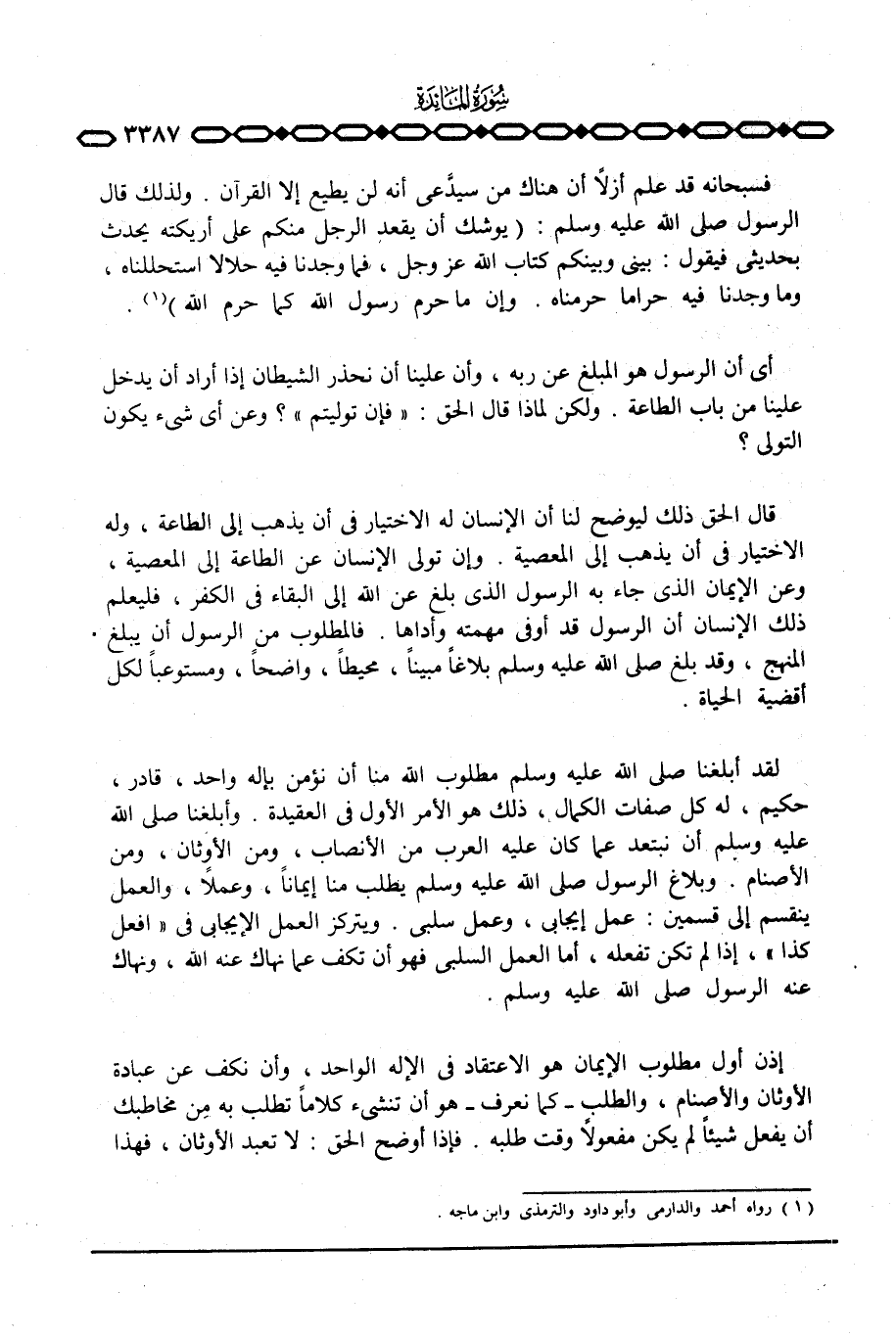 لقد أبلغنا صَلَّى اللَّهُ عَلَيْهِ وَسَلَّم َ مطلوب الله منا أن نؤمن بإله واحد، قادر، حكيم، له كل صفات الكمال، ذلك هو الأمر الأول في العقيدة. وأبلغنا صَلَّى اللَّهُ عَلَيْهِ وَسَلَّم َ أن نبتعد عما كان عليه العرب من الأنصاب، ومن الأوثان، ومن الأصنام. وبلاغ الرسول صَلَّى اللَّهُ عَلَيْهِ وَسَلَّم َ يطلب منا إيماناً، وعملاً، والعمل ينقسم إلى قسمين: عمل إيجابي، وعمل سلبي. ويتركز العمل الإيجابي في «افعل كذا» ، إذا لم تكن تفعله، أما العمل السلبي فهو أن تكف عما نهاك عنه الله، ونهاك عنه الرسول صَلَّى اللَّهُ عَلَيْهِ وَسَلَّم َ.