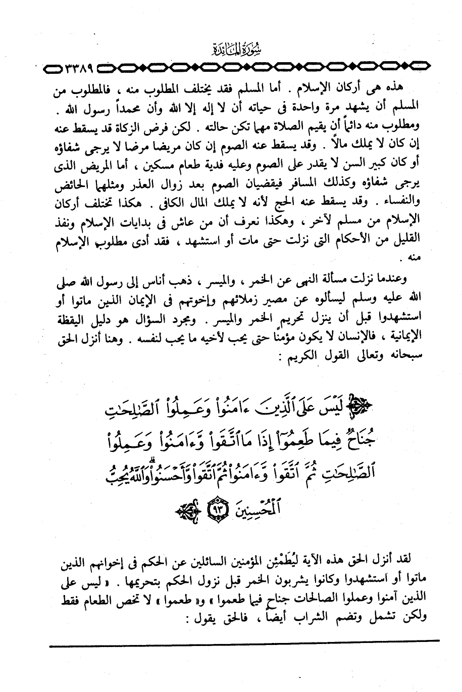 هذه هي أركان الإسلام. أما المسلم فقد يختلف المطلوب منه، فالمطلوب من المسلم أن يشهد مرة واحدة في حياته أن لا إله إلا الله وأن محمداً رسول الله. ومطلوب منه دائماً أن يقيم الصلاة مهما تكن حالته. لكن فرض الزكاة قد يسقط عنه إن كان لا يملك مالاً. وقد يسقط عنه الصوم إن كان مريضاً مرضا لا يرجى شفاؤه أو كان كبير السن لا يقدر على الصوم وعليه فدية طعام مسكين، أما المريض الذي يرجى شفاؤه وكذلك المسافر فيقضيان الصوم بعد زوال العذر ومثلهما الحائض والنفساء. وقد يسقط عنه الحج لأنه لا يملك المال الكافي. هكذا تختلف أركان الإسلام من مسلم لآخر، وهكذا نعرف أن من عاش في بدايات الإسلام ونفذ القليل من الأحكام التي نزلت حتى مات أو استشهد، فقد أدى مطلوب الإسلام منه.