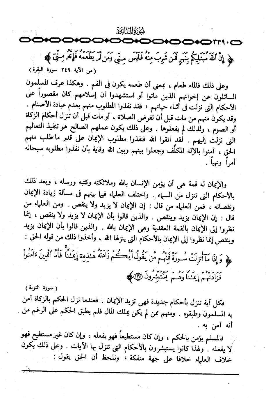 والإيمان له قمة هي أن يؤمن الإنسان بالله وملائكته وكتبه ورسله، وبعد ذلك بالأحكام التي تنزل من السماء. واختلف العلماء فيما بينهم في مسألة زيادة الإيمان ونقصانه، فمن العلماء من قال: إن الإيمان لا يزيد ولا ينقص، إنما نظروا إلى الإيمان بالقمة العقدية وهي الإيمان بالله: والذين قالوا بأن الإيمان يزيد وينقص إنما نظروا إلى الإيمان بالأحكام التي ينزلها الله، وأخذوا ذلك من قوله الحق: {وَإِذَا مَآ أُنزِلَتْ سُورَةٌ فَمِنْهُمْ مَّن يَقُولُ أَيُّكُمْ زَادَتْهُ هذه إِيمَاناً فَأَمَّا الذين آمَنُواْ فَزَادَتْهُمْ إِيمَاناً وَهُمْ يَسْتَبْشِرُونَ} [التوبة: 124] .