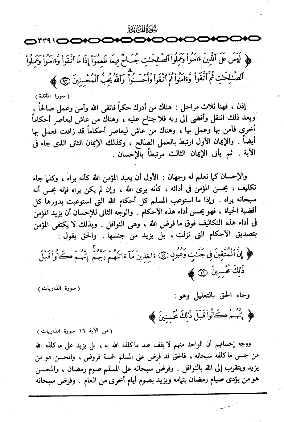 {لَيْسَ عَلَى الذين آمَنُواْ وَعَمِلُواْ الصالحات جُنَاحٌ فِيمَا طعموا إِذَا مَا اتقوا وَآمَنُواْ وَعَمِلُواْ الصَّالِحَاتِ ثُمَّ اتَّقَواْ وَآمَنُواْ ثُمَّ اتَّقَواْ وَّأَحْسَنُواْ والله يُحِبُّ المحسنين} [المائدة: 93] .