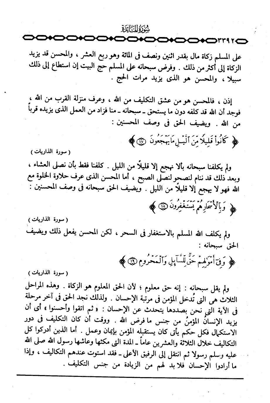 إذن، فالمحسن هو من عشق التكليف من الله، وعرف منزلة القرب من الله، فوجد أن الله قد كلفه دون ما يستحق - سبحانه - منا فزاد من العمل الذي يزيده قرباً من الله. ويضيف الحق في وصف المحسنين: {كَانُواْ قَلِيلاً مِّن الليل مَا يَهْجَعُونَ} [الذاريات: 17] .