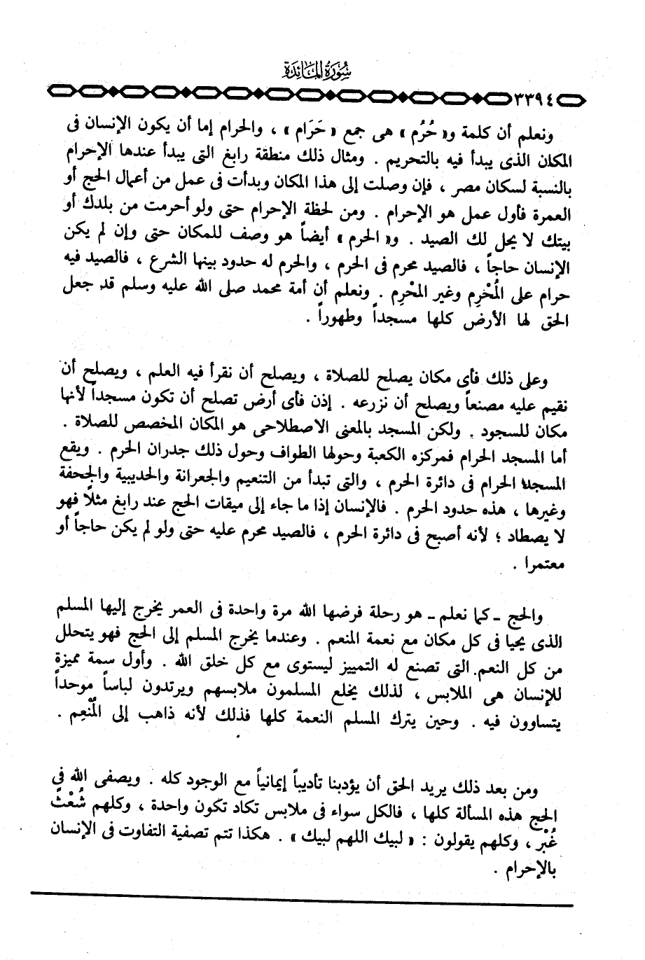ومن بعد ذلك يريد الحق أن يؤدبنا تأديباً إيمانياً مع الوجود كله. ويصفي الله في الحج هذه المسألة كلها، فالكل سواء في ملابس تكاد تكون واحدة، وكلهم شُعْثٌ غُبْر، وكلهم يقولون: «لبيك اللهم لبيك» . هكذا تتم تصفية التفاوت في الإنسان بالإحرام.
