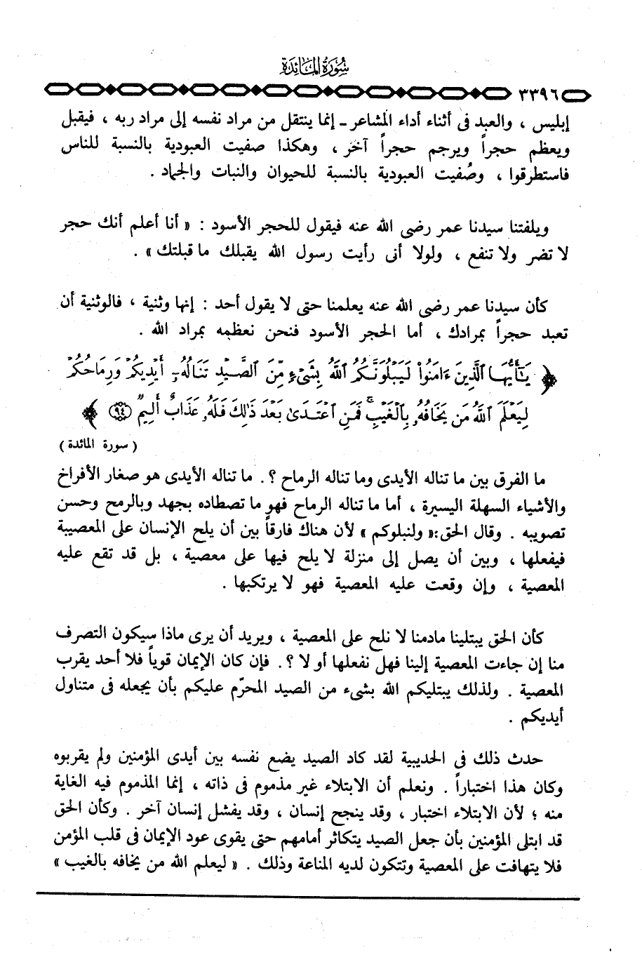 كأن سيدنا عمر رَضِيَ اللَّهُ عَنْه يعلمنا حتى لا يقول أحد: إنها وثنية، فالوثنية أن تعبد حجراً بمرادك، أما الحجر الأسود فنحن نعظمه بمراد الله. {ياأيها الذين آمَنُواْ لَيَبْلُوَنَّكُمُ الله بِشَيْءٍ مِّنَ الصيد تَنَالُهُ أَيْدِيكُمْ وَرِمَاحُكُمْ لِيَعْلَمَ الله مَن يَخَافُهُ بالغيب فَمَنِ اعتدى بَعْدَ ذلك فَلَهُ عَذَابٌ أَلِيمٌ} [المائدة: 94] .
