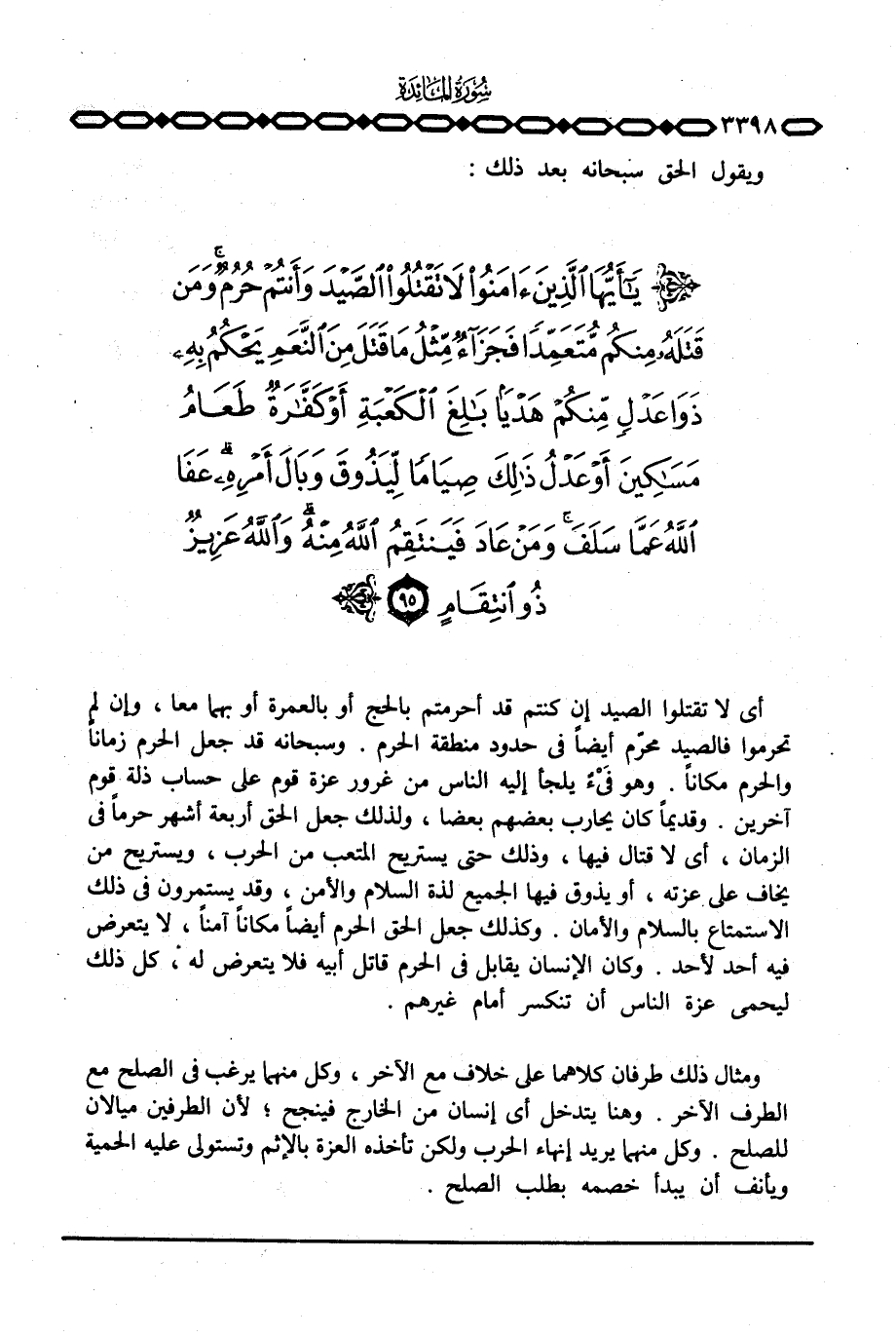 أي لا تقتلوا الصيد إن كنتم قد أحرمتم بالحج أو بالعمرة أو بهما معا، وإن لم تحرموا فالصيد محرّم أيضاً في حدود منطقة الحرم. وسبحانه قد جعل الحرم زماناً والحرم مكاناً. وهو فَيْءٌ يلجأ إليه الناس من غرور عزة قوم على حساب ذلة قوم آخرين. وقديماً كان يحارب بعضهم بعضا، ولذلك جعل الحق أربعة أشهر حرماً في الزمان، أي لا قتال فيها، وذلك حتى يستريح المتعب من الحرب، ويستريح من يخاف على عزته، أو يذوق فيها الجميع لذة السلام والأمن، وقد يستمرون في ذلك الاستمتاع بالسلام والأمان. وكذلك جعل الحق الحرم أيضاً مكاناً آمناً، لا يتعرض فيه أحد لأحد. وكان الإنسان يقابل في الحرم قاتل أبيه فلا يتعرض له، كل ذلك ليحمي عزة المسلمين أن تنكسر أمام غيرهم.