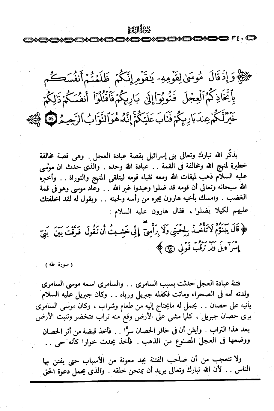 يذكّر الله تبارك وتعالى بني إسرائيل بقصة عبادة العجل. وهي قصة مخالفة خطيرة لمنهج الله ومخالفة في القمة. . عبادة الله وحده. والذي حدث أن موسى عليه السلام ذهب لميقات الله ومعه نقباء قومه ليتلقى المنهج والتوراة. . وأخبره الله سبحانه وتعالى أن قومه قد ضلوا وعبدوا غير الله. . وعاد موسى وهو في قمة الغضب. وأمسك بأخيه هارون يجره من رأسه ولحيته. . ويقول له لقد اخلفتك عليهم لكيلا يضلوا، فقال هارون عليه السلام: {قَالَ يَبْنَؤُمَّ لاَ تَأْخُذْ بِلِحْيَتِي وَلاَ بِرَأْسِي إِنِّي خَشِيتُ أَن تَقُولَ فَرَّقْتَ بَيْنَ بني إِسْرَآئِيلَ وَلَمْ تَرْقُبْ قَوْلِي} [طه: 94]