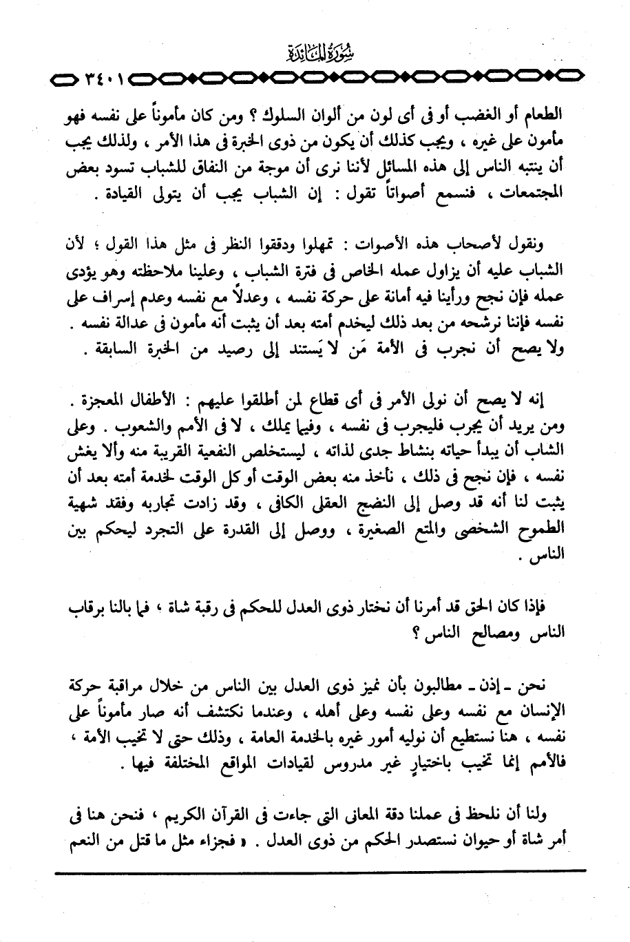 ونقول لأصحاب هذه الأصوات: تمهلوا ودققوا النظر في مثل هذا القول؛ لأن الشباب عليه أن يزاول عمله الخاص في فترة الشباب، وعلينا ملاحظته وهو يؤدي عمله فإن نجح ورأينا فيه أمانة على حركة نفسه، وعدلاً مع نفسه وعدم إسراف على نفسه فإننا نرشحه من بعد ذلك ليخدم أمته بعد أن يثبت أنه مأمون في عدالة نفسه. ولا يصح أن نجرب في الأمة مَن لا يَستند إلى رصيد من الخبرة السابقة.