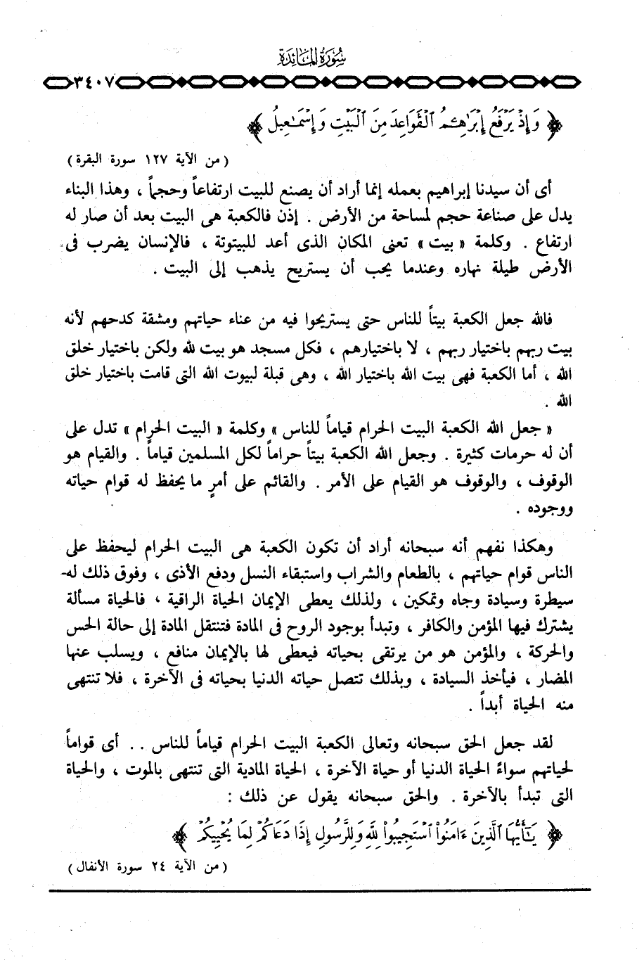 وهكذا نفهم أنه سبحانه أراد أن تكون الكعبة هي البيت الحرام ليحفظ على الناس قوام حياتهم، بالطعام والشراب واستبقاء النسل ودفع الأذى، وفوق ذلك له سيطرة وسيادة وجاه وتمكين، ولذلك يعطي الإيمان الحياة الراقية، فالحياة مسألة يشترك فيها المؤمن والكافر، وتبدأ بوجود الروح في المادة فتنتقل المادة إلى الحالة الحس والحركة، والمؤمن هو من يرتقي بحياته فيعطي لها بالإيمان منافع، ويسلب عنها المضار، فيأخذ السيادة، وبذلك تتصل حياته الدنيا بحياته في الآخرة، فلا تنتهي منه الحياة أبداً.