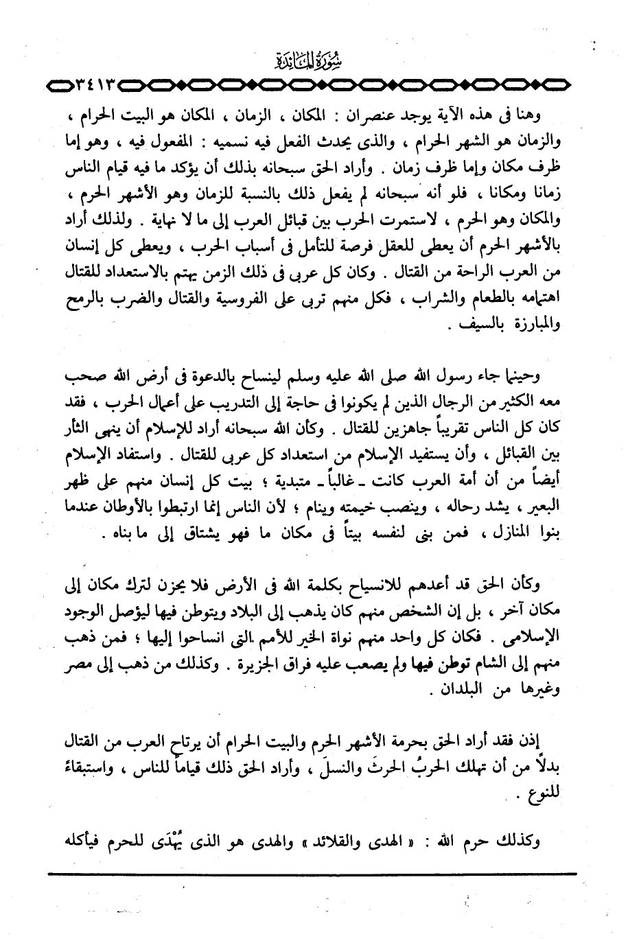 وهنا في هذه الآية يوجد عنصران: المكان، والزمان، المكان هو البيت الحرام، والزمان هو الشهر الحرام، والذي يحدث الفعل فيه نسميه: المفعول فيه، وهو إما ظرف مكان وإما ظرف زمان. وأراد الحق سبحانه بذلك أن يؤكد ما فيه قيام الناس زمانا ومكانا، فلو أنه سبحانه لم يفعل ذلك بالنسبة للزمان وهو الأشهر الحرم، والمكان وهو الحرم، لاستمرت الحرب بين قبائل العرب إلى ما لا نهاية. ولذلك أراد بالأشهر الحرم أن يعطي للعقل فرصة للتأمل في أسباب الحرب، ويعطي كل إنسان من العرب الراحة من القتال. وكان كل عربي في ذلك الزمن يهتم بالاستعداد للقتال اهتمامه بالطعام والشراب، فكل منهم تربى على الفروسية والقتال والضرب بالرمح والمبارزة بالسيف.