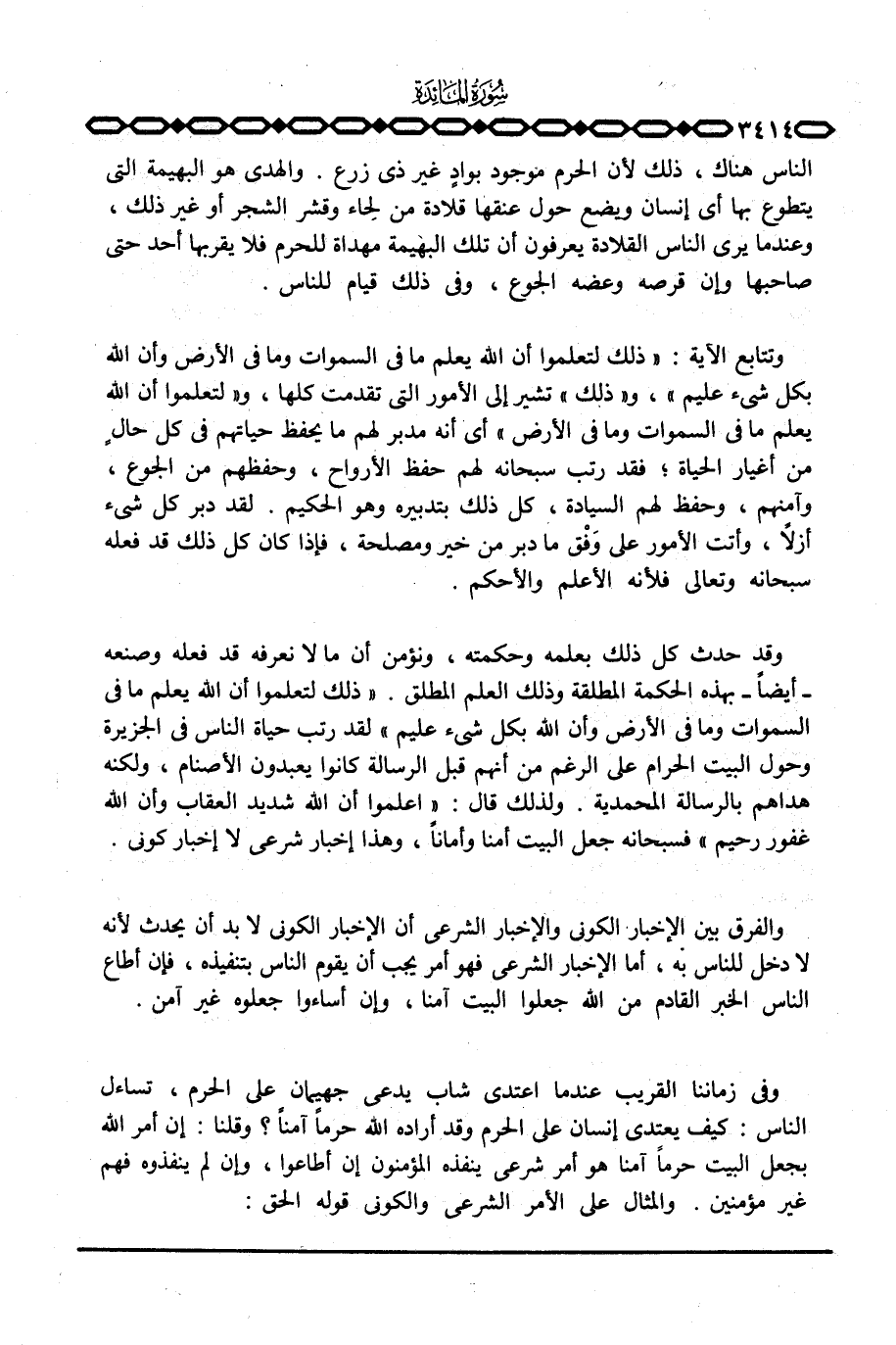 وفي زماننا القريب عندما اعتدى شاب يدعى جهيمان على الحرم، تساءل الناس: كيف يعتدي إنسان على الحرم وقد أراده الله حرماً آمناً؟ وقلنا: إن أمر الله بجعل البيت حراماً آمنا هو أمر شرعي ينفذه المؤمنون إن أطاعوا، وإن لم ينفذوه فهم غير مؤمنين. والمثال على الأمر الشرعي والكوني قوله الحق:
