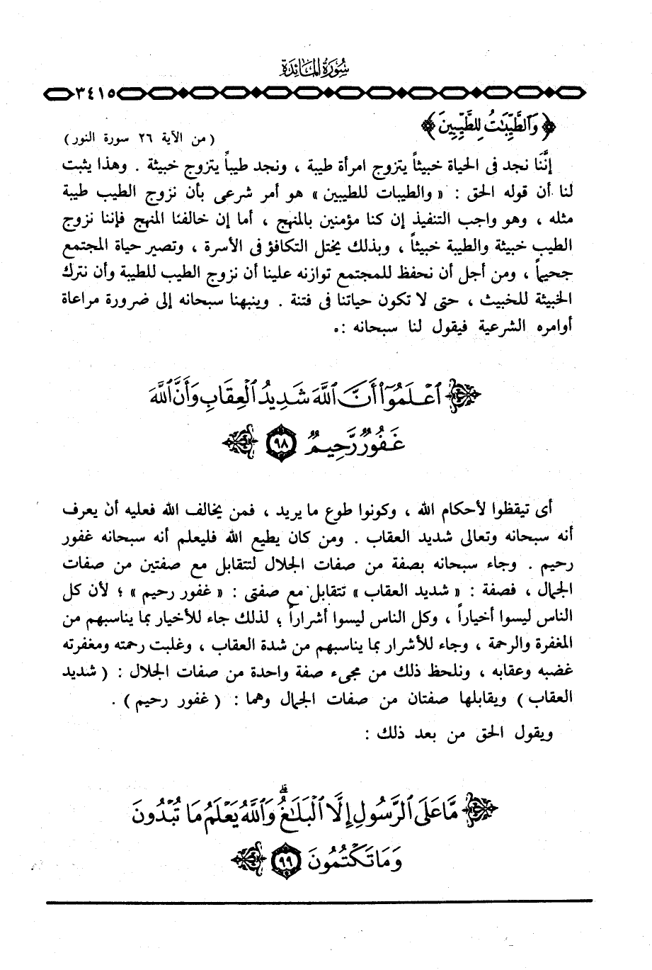 أي تيقظوا لأحكام الله، وكونوا طوع ما يريد، فمن يخالف الله فعليه أن يعرف أنه سبحانه وتعالى شديد العقاب. ومن كان يطيع الله فليعلم أنه سبحانه غفور رحيم. وجاء سبحانه بصفة من صفات الجلال لتتقابل مع صفتين من صفات الجمال، فصفة: {شَدِيدُ العقاب} تتقابل مع صفتي: {غَفُورٌ رَّحِيمٌ} ؛ لأن كل الناس ليسوا أخياراً، وكل الناس ليسوا أشراراً؛ لذلك جاء للأخيار بما يناسبهم من المغفرة والرحمة، وجاء للأشرار بما يناسبهم من شدة العقاب، وغلبت رحمته ومغفرته غضبه وعقابه، ونلحظ ذلك من مجيء صفة واحدة من صفات الجلال: {شَدِيدُ العقاب} ويقابلها صفتان من صفات الجمال وهما: {غَفُورٌ رَّحِيمٌ} .