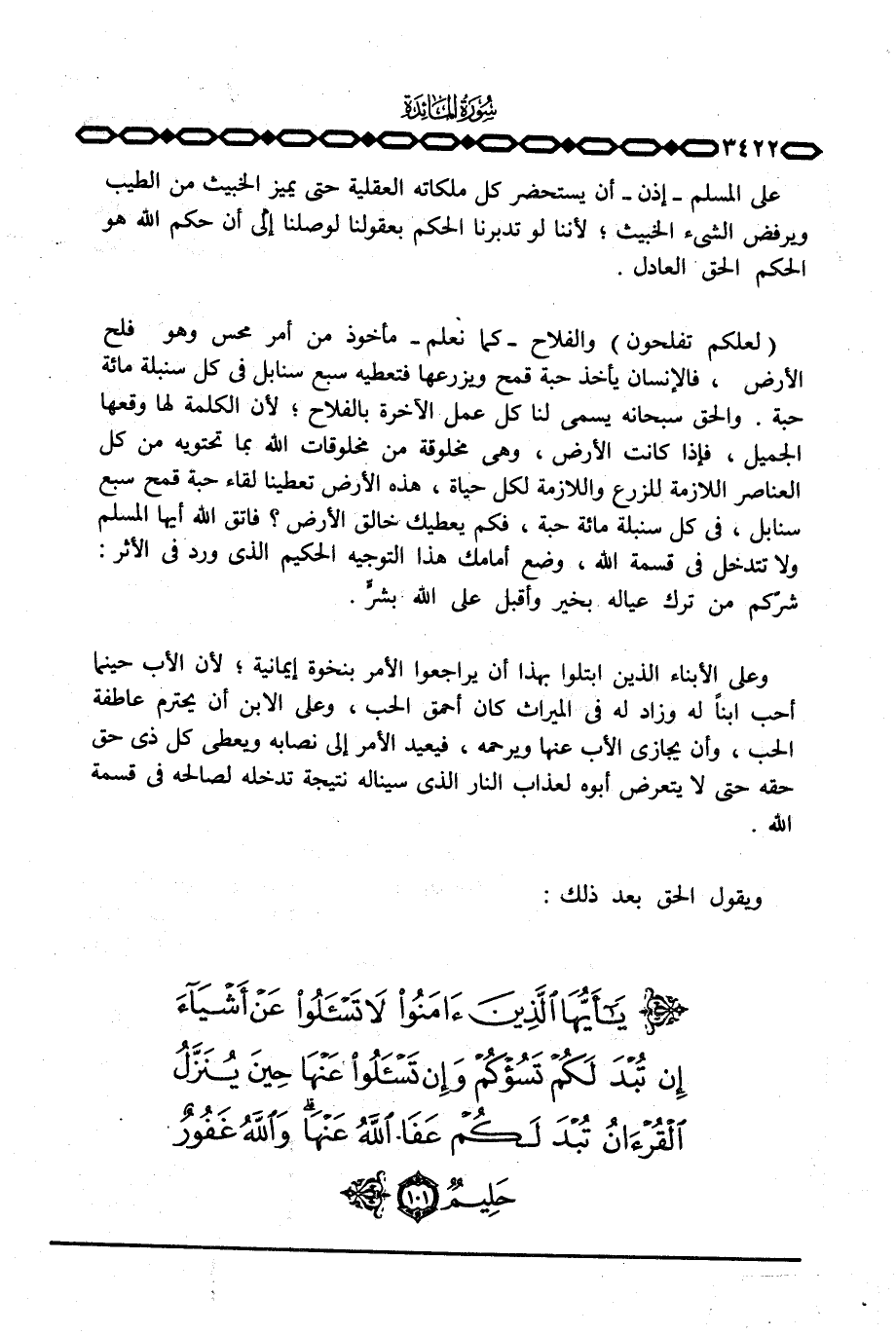 {لَعَلَّكُمْ تُفْلِحُونَ} والفلاح - كما نعلم - مأخوذ من أمر محس وهو فلح الأرض، فالإنسان يأخذ حبة قمح ويزرعها فتعطيه سبع سنابل في كل سنبلة مائة حبة. والحق سبحانه يسمي لنا كل عمل الآخرة بالفلاح؛ لأن الكلمة لها وقعها الجميل، فإذا كانت الأرض، وهي مخلوقة من مخلوقات الله بما تحتويه من كل العناصر اللازمة للزرع واللازمة لكل حياة، هذه الأرض تعطينا لقاء حبة قمح سبع سنابل، في كل سنبلة مائة حبة، فكم يعطيك خالق الأرض؟ فاتق الله أيها المسلم ولا تتدخل في قسمة الله، وضع أمامك هذا التوجيه الحكيم الذي ورد في الأثر: شرّكم من ترك عياله بخير وأقبل على الله بشرِّ.