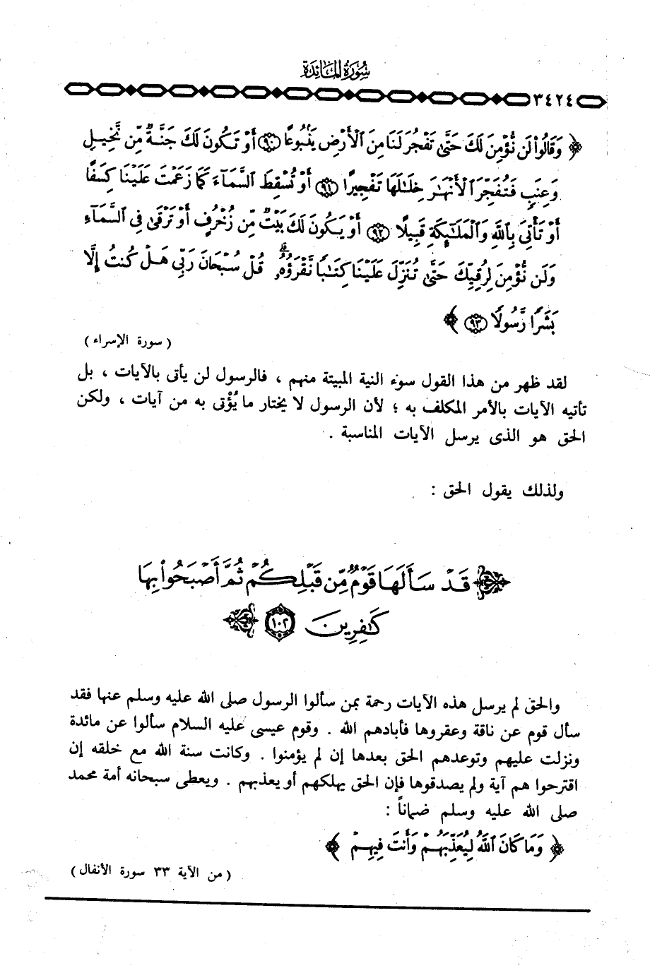 {وَقَالُواْ لَن نُّؤْمِنَ لَكَ حتى تَفْجُرَ لَنَا مِنَ الأرض يَنْبُوعاً أَوْ تَكُونَ لَكَ جَنَّةٌ مِّن نَّخِيلٍ وَعِنَبٍ فَتُفَجِّرَ الأنهار خِلالَهَا تَفْجِيراً أَوْ تُسْقِطَ السمآء كَمَا زَعَمْتَ عَلَيْنَا كِسَفاً أَوْ تَأْتِيَ بالله والملائكة قَبِيلاً أَوْ يَكُونَ لَكَ بَيْتٌ مِّن زُخْرُفٍ أَوْ ترقى فِي السمآء وَلَن نُّؤْمِنَ لِرُقِيِّكَ حَتَّى تُنَزِّلَ عَلَيْنَا كِتَاباً نَّقْرَؤُهُ قُلْ سُبْحَانَ رَبِّي هَلْ كُنتُ إِلاَّ بَشَراً رَّسُولاً} [الإسراء: 90 - 93] .