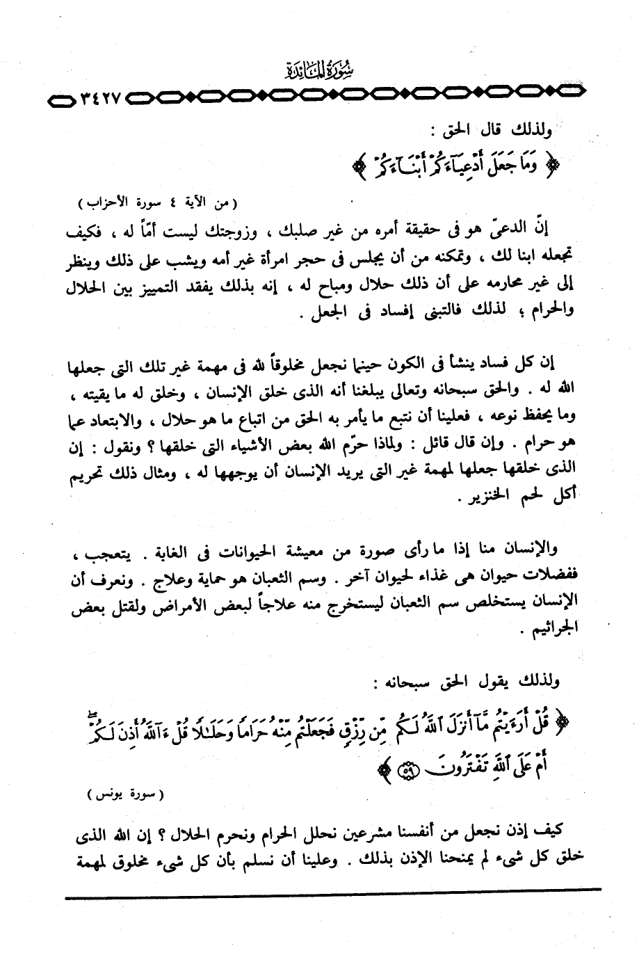 إن كل فساد ينشأ في الكون حينما نجعل مخلوقاً لله في مهمة غير تلك التي جعلها الله له. والحق سبحانه وتعالى يبلغنا أنه الذي خلق الإنسان، وخلق له ما يقيته، وما يحفظ نوعه، فعلينا أن نتبع ما يأمر به الحق من اتباع ما هو حلال، والابتعاد عما هو حرام. وإن قال قائل: ولماذا حرّم الله بعض الأشياء التي خلقها؟ ونقول: إن الذي خلقها جعلها لمهمة غير التي يريد الإنسان أن يوجهها له، ومثال ذلك تحريم أكل لحم الخنزير.