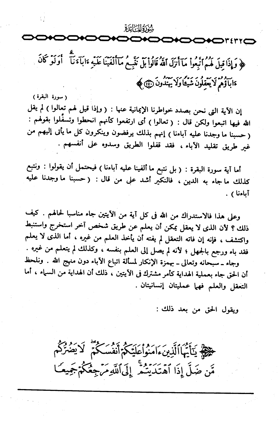 وجاء - سبحانه وتعالى - بهمزة الإنكار لمسألة اتباع الآباء دون منهج الله. ونلحظ أن الحق جاء بعملية الهداية كأمر مشترك في الآيتين، ذلك أن الهداية من السماء، أما التعقل والعلم فهما عمليتان إنسانيتان.