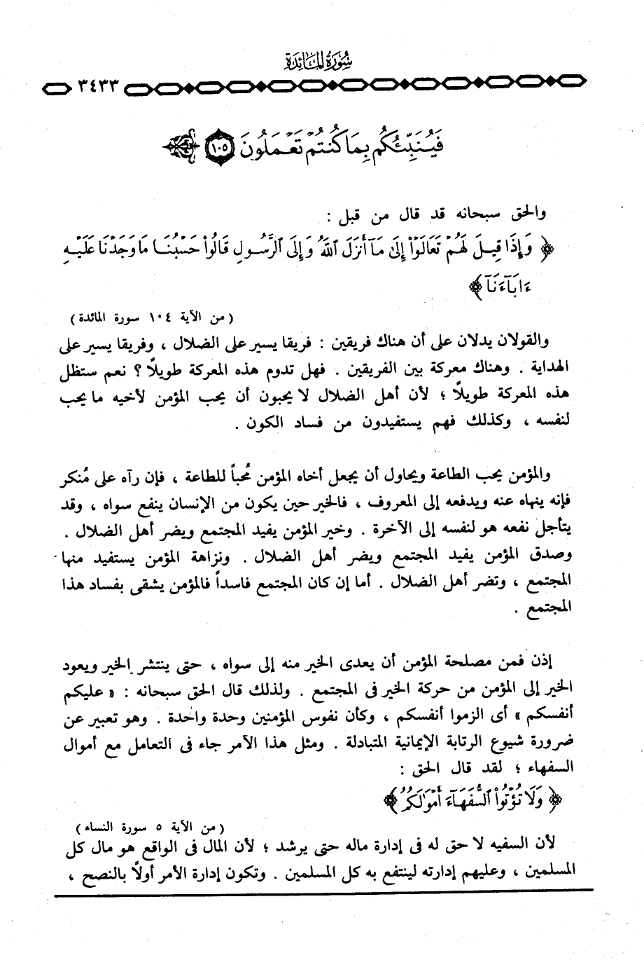 إذن فمن مصلحة المؤمن أن يعدي الخير منه إلى سواه، حتى ينتشر الخير ويعود الخير إلى المؤمن من حركة الخير في المجتمع. ولذلك قال الحق سبحانه: {عَلَيْكُمْ أَنْفُسَكُمْ} أي ألزموا أنفسكم، وكأن نفوس المؤمنين وحدة واحدة. وهو تعبير عن ضرورة شيوع الرتابة الإيمانية المتبادلة. ومثل هذا الأمر جاء في التعامل مع أموال السفهاء؛ لقد قال الحق: {وَلاَ تُؤْتُواْ السفهآء أَمْوَالَكُمُ} [النساء: 5] .