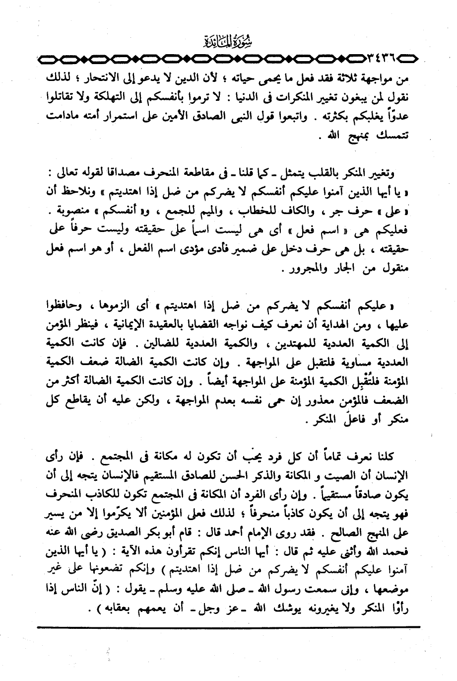 {عَلَيْكُمْ أَنْفُسَكُمْ لاَ يَضُرُّكُمْ مَّن ضَلَّ إِذَا اهتديتم} أي ألزموها، وحافظوا عليها، ومن الهداية أن نعرف كيف نواجه القضايا بالعقيدة الإيمانية، فينظر المؤمن إلى الكمية العددية للمهتدين، والكمية العددية للضالين. فإن كانت الكمية العددية مساوية فلتقبل على المواجهة. وإن كانت الكمية الضالة ضعف الكمية المؤمنة فلتُقْبِل الكمية المؤمنة على المواجهة أيضاً. وإن كانت الكمية الضالة أكثر من الضعف فالمؤمن معذور إن حمى نفسه بعدم المواجهة، ولكن عليه أن يقاطع كل منكر أو فاعلَ المنكر.