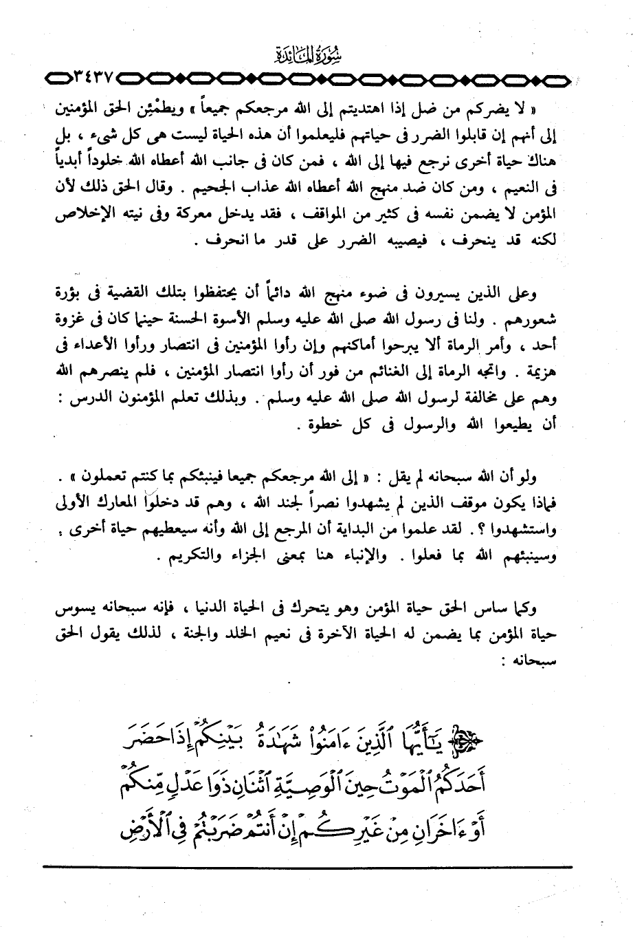 وعلى الذي يسيرون في ضوء منهج الله دائماً أن يحتفظوا بتلك القضية في بؤرة شعورهم. ولنا في رسول الله صَلَّى اللَّهُ عَلَيْهِ وَسَلَّم َ الأسوة الحسنة حينما كان في غزوة أحد، وأمر الرماة ألا يبرحوا أماكنهم وإن رأوا المؤمنين في انتصار ورأوا الأعداء في هزيمة. واتجه الرماة إلى الغنائم من فور أن رأوا انتصار المؤمنين، فلم ينصرهم الله وهم على مخالفة لرسول الله صَلَّى اللَّهُ عَلَيْهِ وَسَلَّم َ. وبذلك تعلم المؤمنون الدرس: أن يطيعوا الله والرسول في كل خطوة.