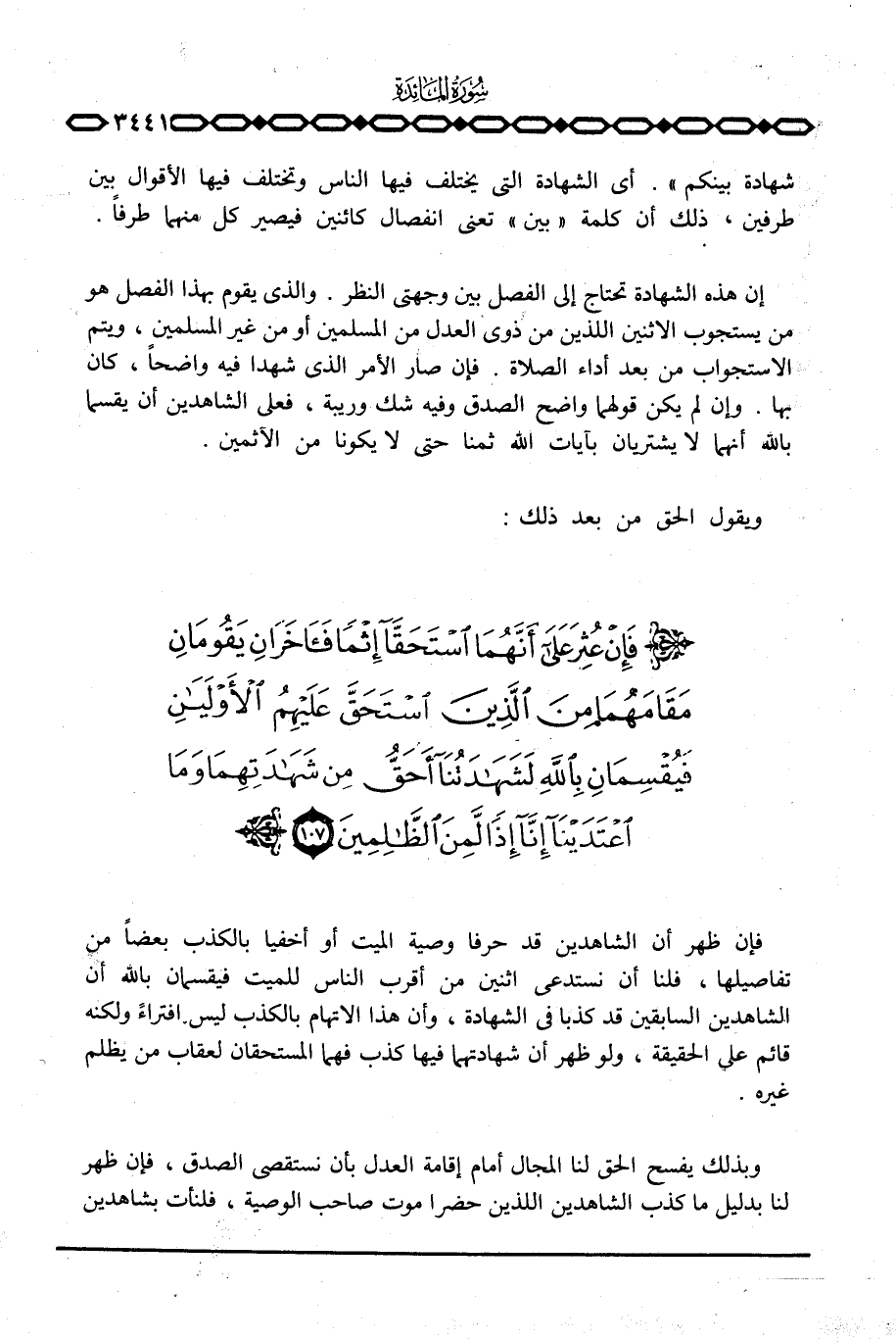 إن هذه الشهادة تحتاج إلى الفصل بين وجهتي النظر. والذي يقوم بهذا الفصل هو من يستجوب الاثنين اللذين من ذوي العدل من المسلمين أو من غير المسلمين، ويتم الاستجواب من بعد أداء الصلاة. فإن صار الأمر الذي شهدا فيه واضحاً، كان بها. وإن لم يكن قولهما واضح الصدق وفيه شك وريبة، فعلى الشاهدين أن يقسما بالله أنهما لا يشتريان بآيات الله ثمنا حتى لا يكونا من الآثمين.